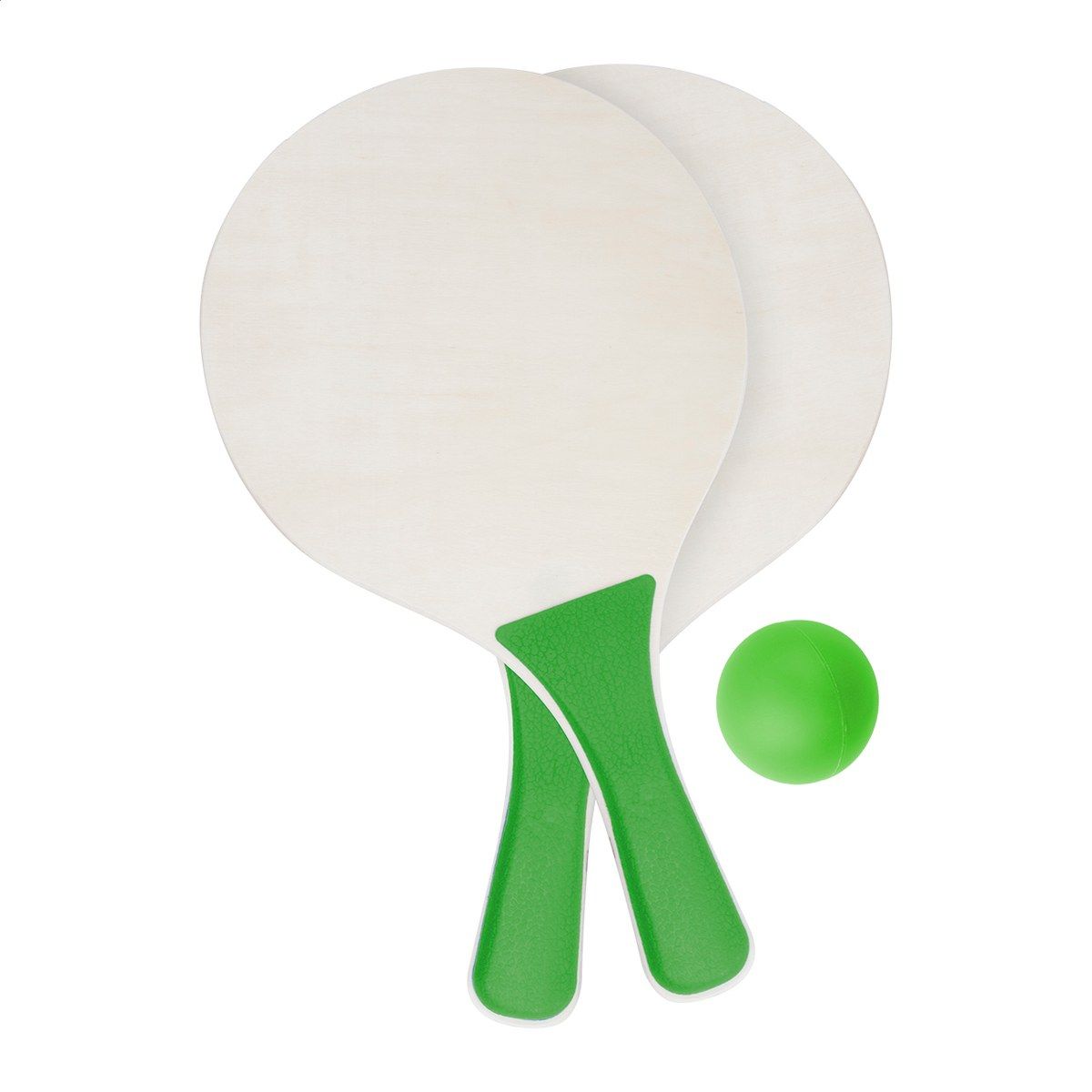 2 rakety a jeden míček, vyrobeno ze dřeva a plastu.