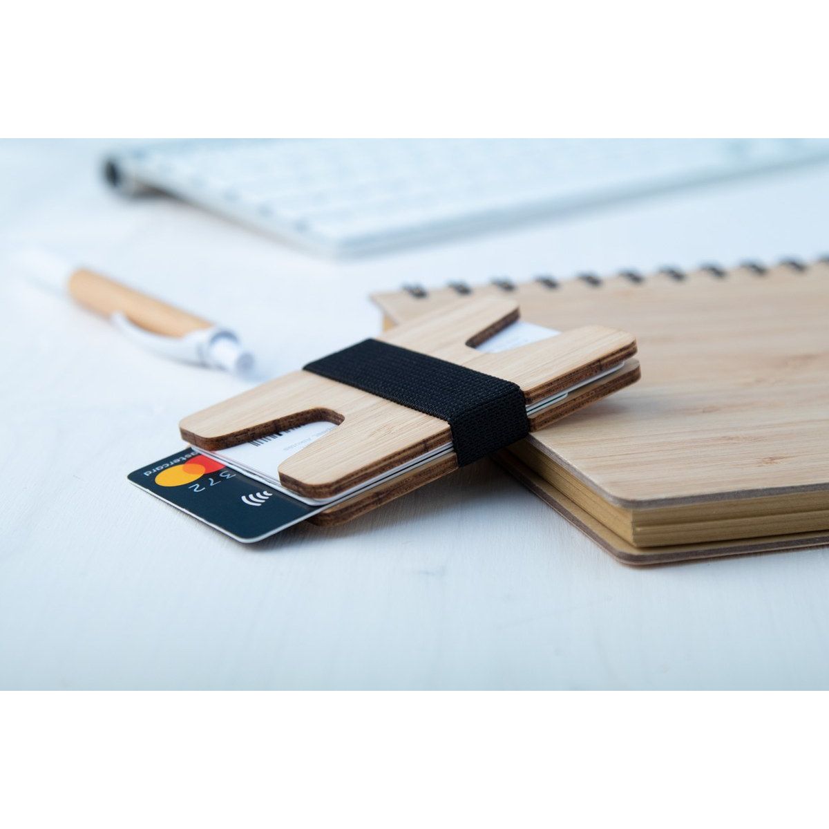 Držák na karty z bambusové překližky s gumovým páskem.