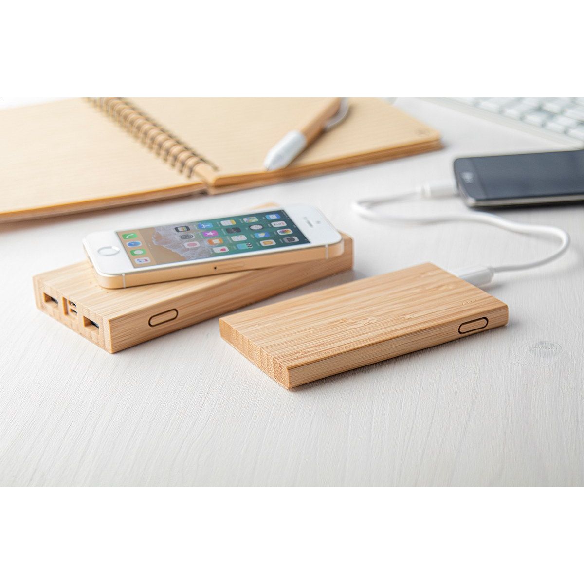 Bambusová USB power banka s vestavěnou bezdrátovou nabíječkou, 2 nabíjecími porty a 6000 mAh baterií. Power banka může být nabíjena prostřednictvím micro USB a USB-C portů. Včetně nabíjecího kabelu micro USB.