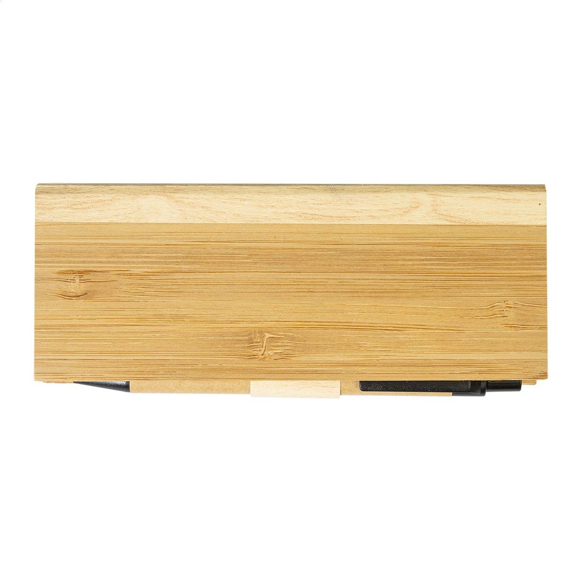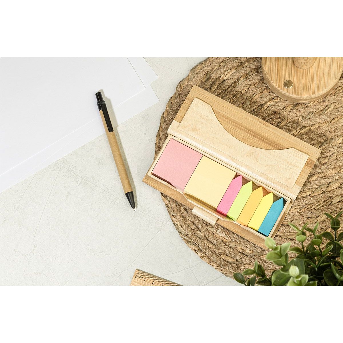 Samolepící poznámkový blok s 220 nalepovacími papírky (ve 2 různých barvách) a 550 značkovači stránek (v 5 různých barvách) v bambusovém pouzdře. Včetně 12 cm pravítka a propisky z recyklovaného kartonu s modrou náplní.