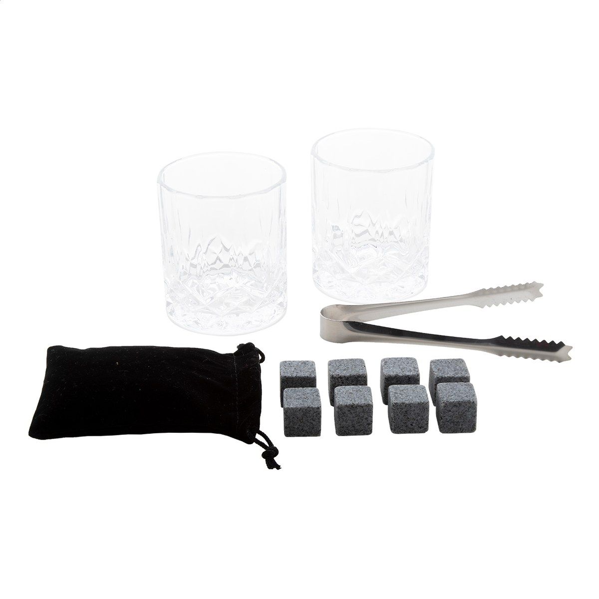 Luxusní whisky set v dárkové krabičce z bambusu. Obsahuje 2 sklenice na whisky (250 ml), 8 opakovaně použitelných kamenných kostek ledu s úložným pouzdrem a nerezové kleště.