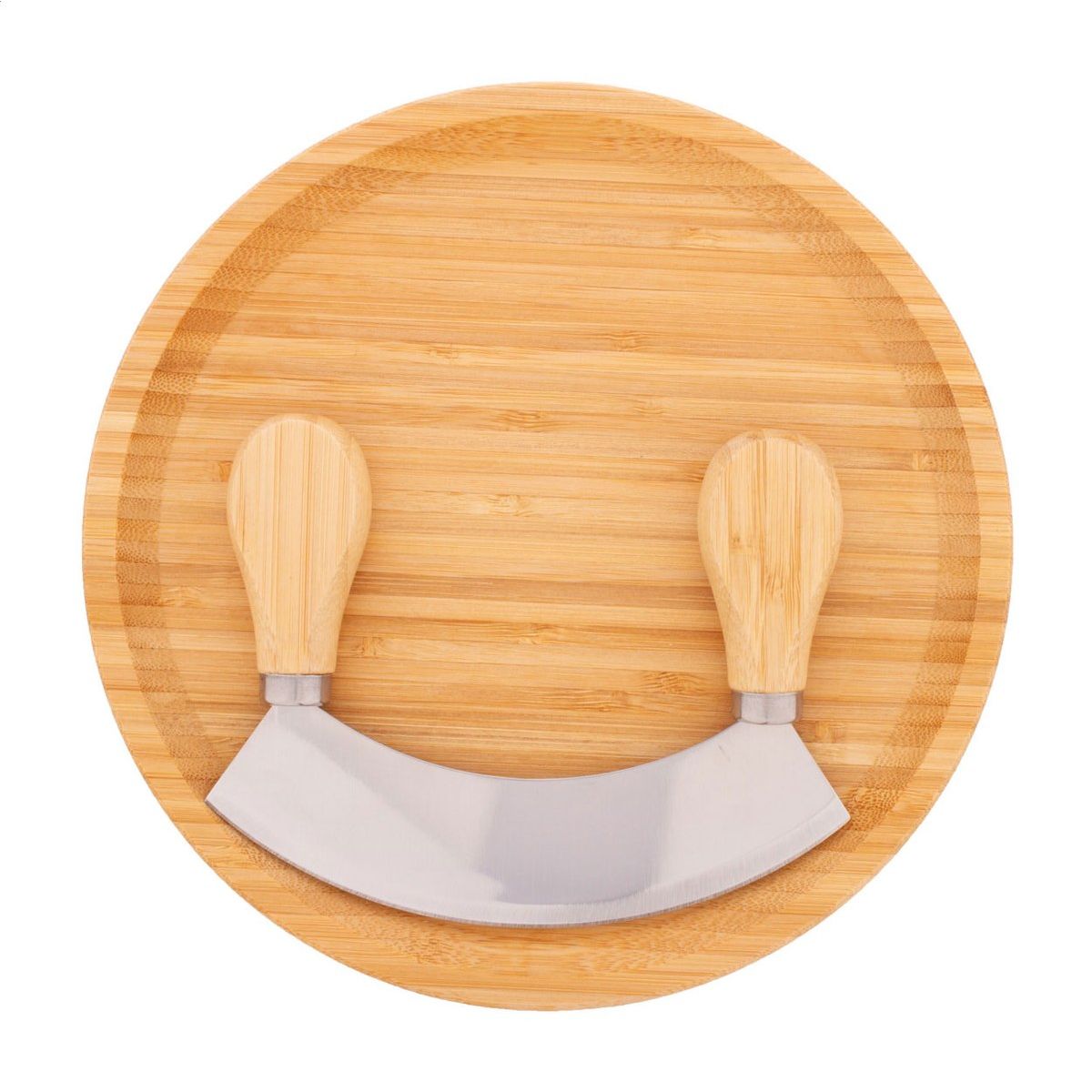 Sada z bambusu na krájení bylin, včetně kulatého bambusového prkénka a nerezového kráječe na bylinky s bambusovými rukojeťmi.