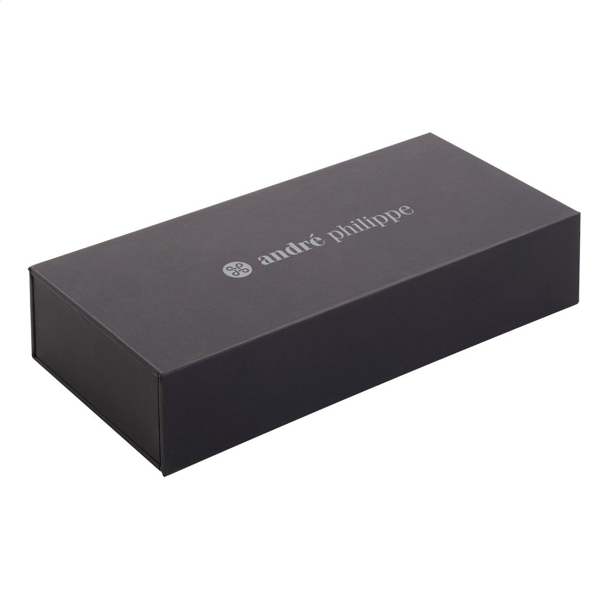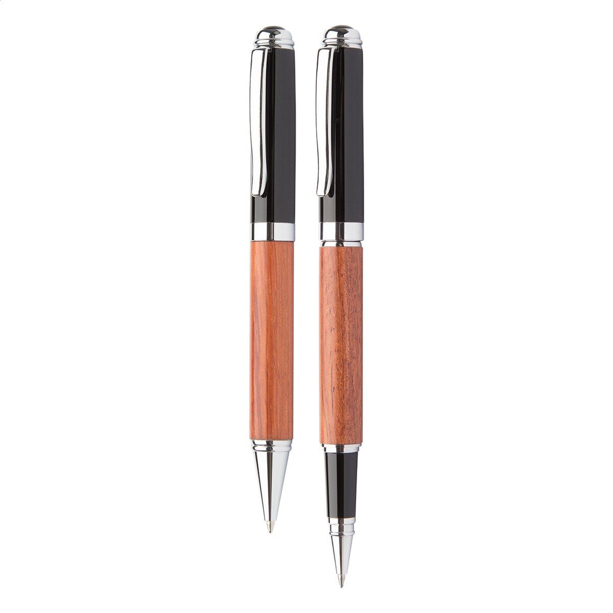 Elegantní sada kovového kuličkového pera a rolleru s tělem v růžovém dřevu. V dárkové krabičce z PU kůže a s modrou náplní. Značkový produkt André Philippe.