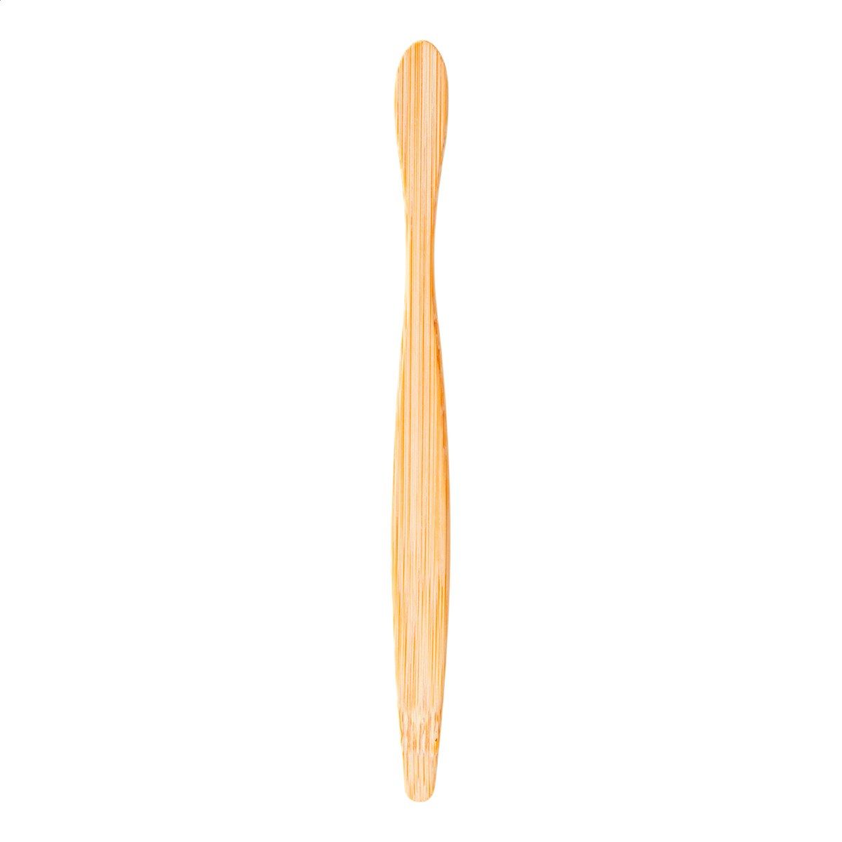 Přírodní bambusový kartáček na zuby s nylonovými štětinami v papírové krabičce.