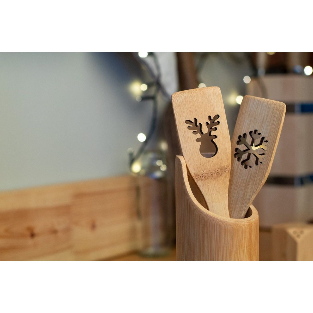 Vařečka z bambusu s vyřezaným vánočním stromečkem.