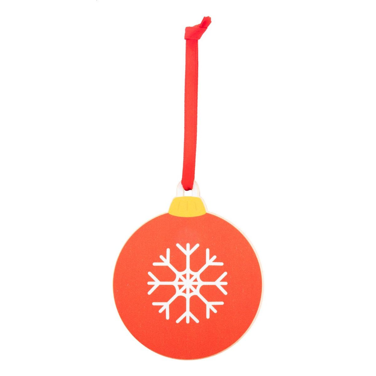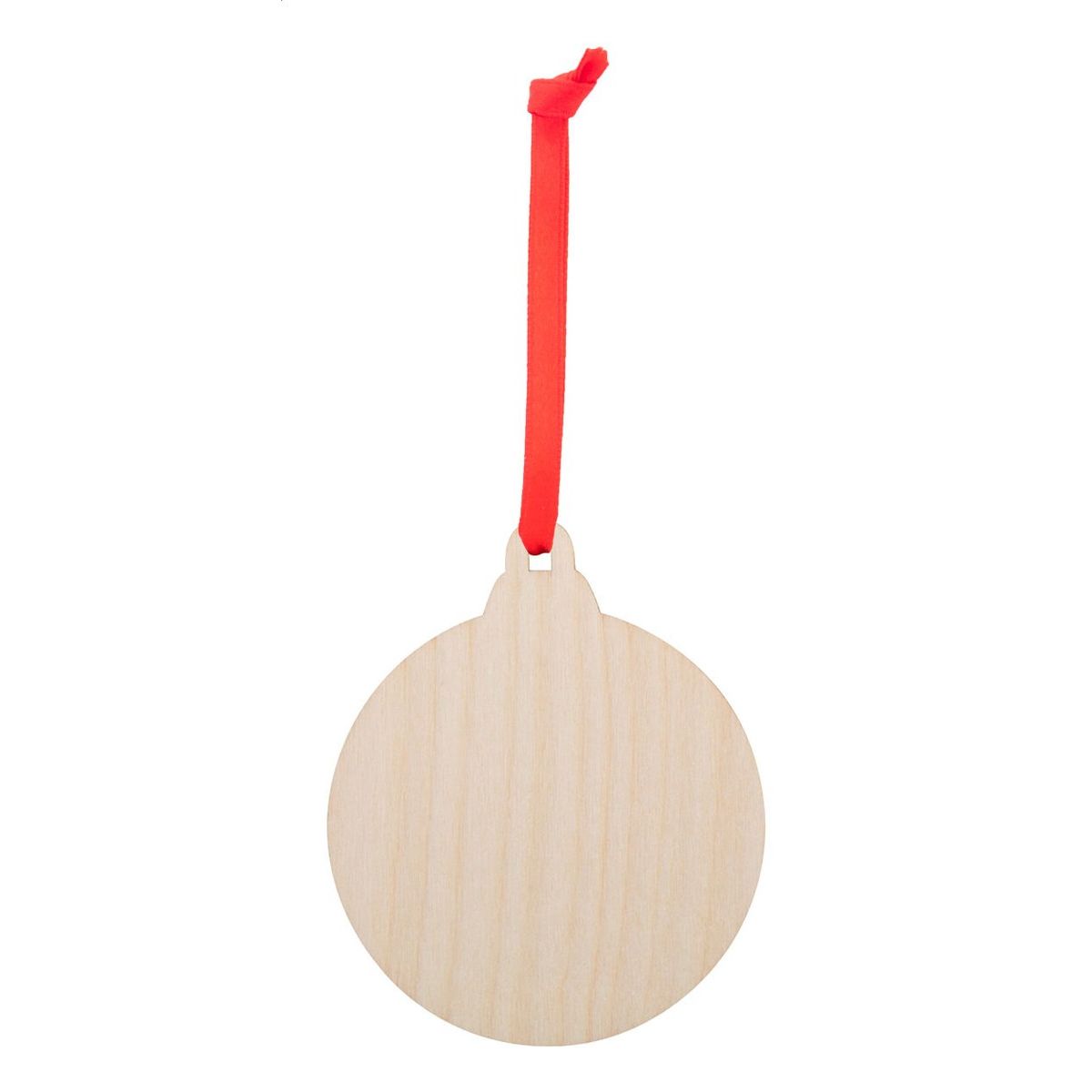 Vánoční ozdoba z březové překližky, s tištěným vánočním designem a červenou stužkou, která je dodávána zvlášť.