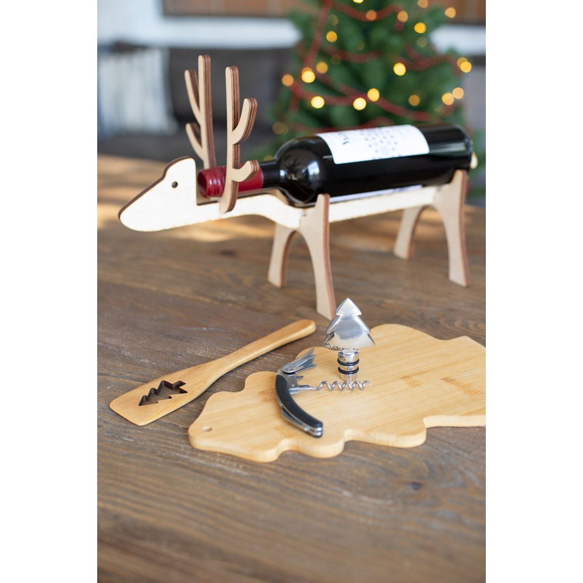 Stojan na láhev z březové překližky ve tvaru soba. Dodáváno rozložené.
