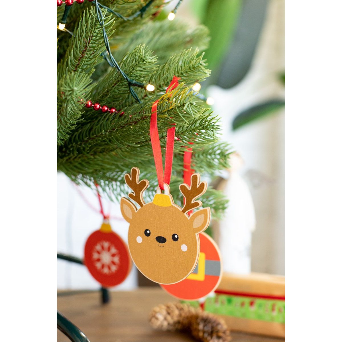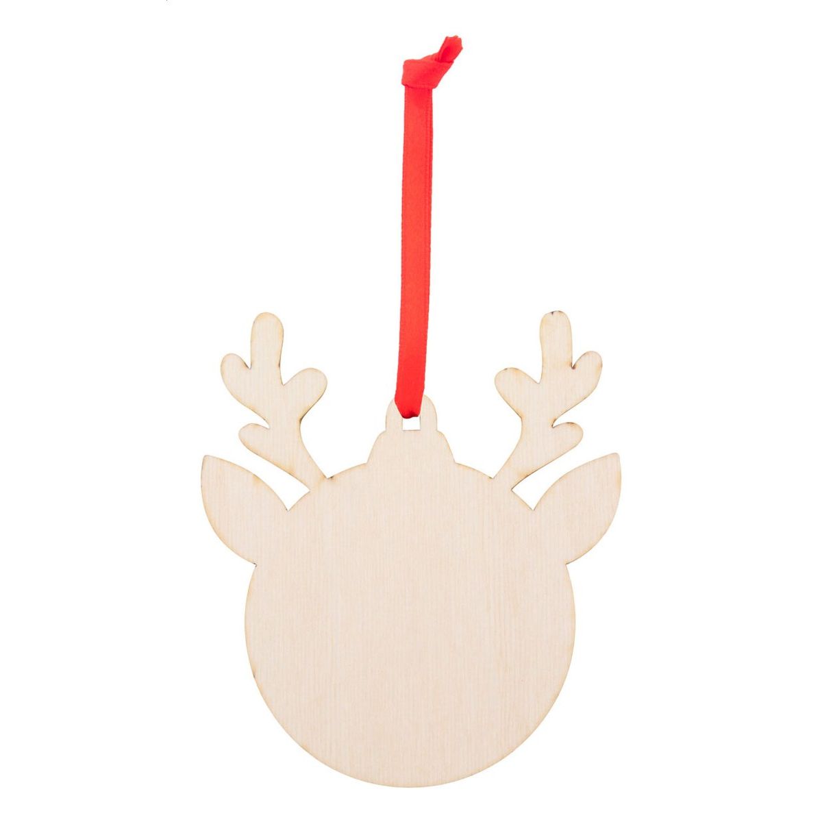 Vánoční ozdoba z březové překližky, s tištěným vánočním designem a červenou stužkou, která je dodávána zvlášť.
