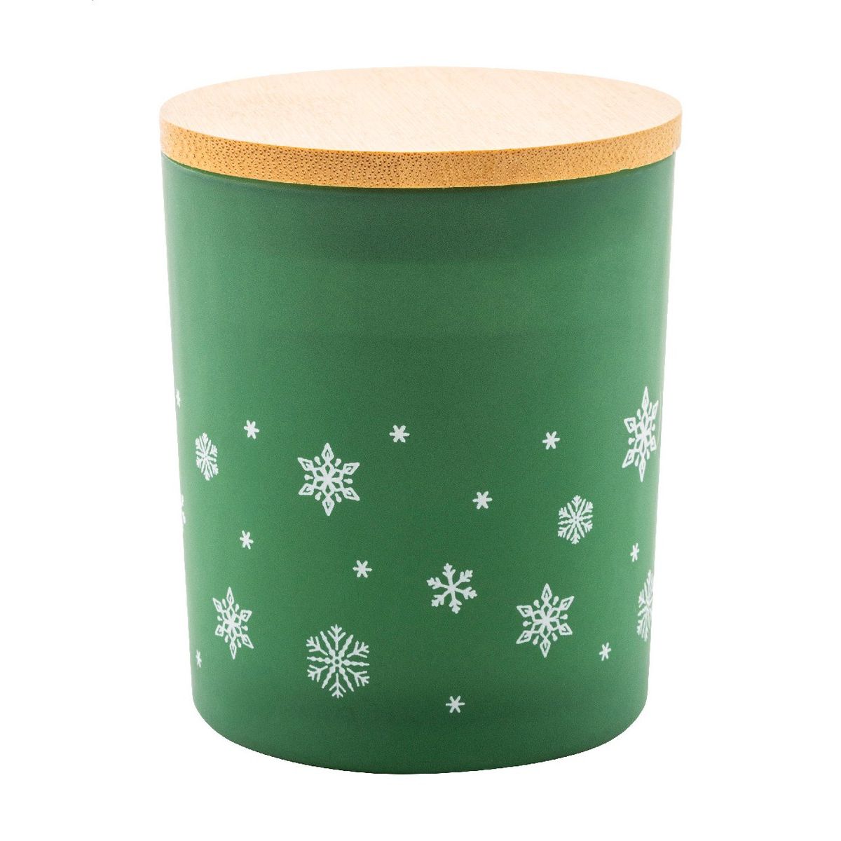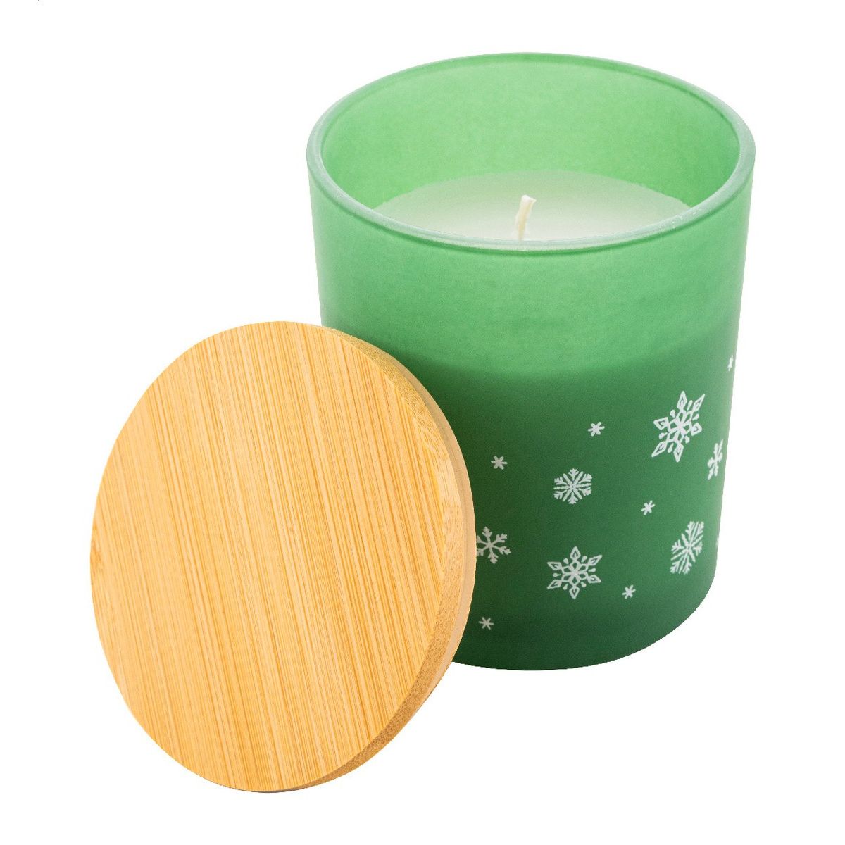 Vonná vosková svíčka na rostlinné bázi v matném skleněném svícnu s vánoční ozdobou ve tvaru sněhové vločky a bambusovým víčkem. Se 120 gramy vosku. V krabičce z kraftového papíru.