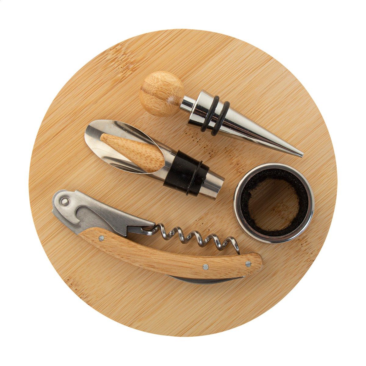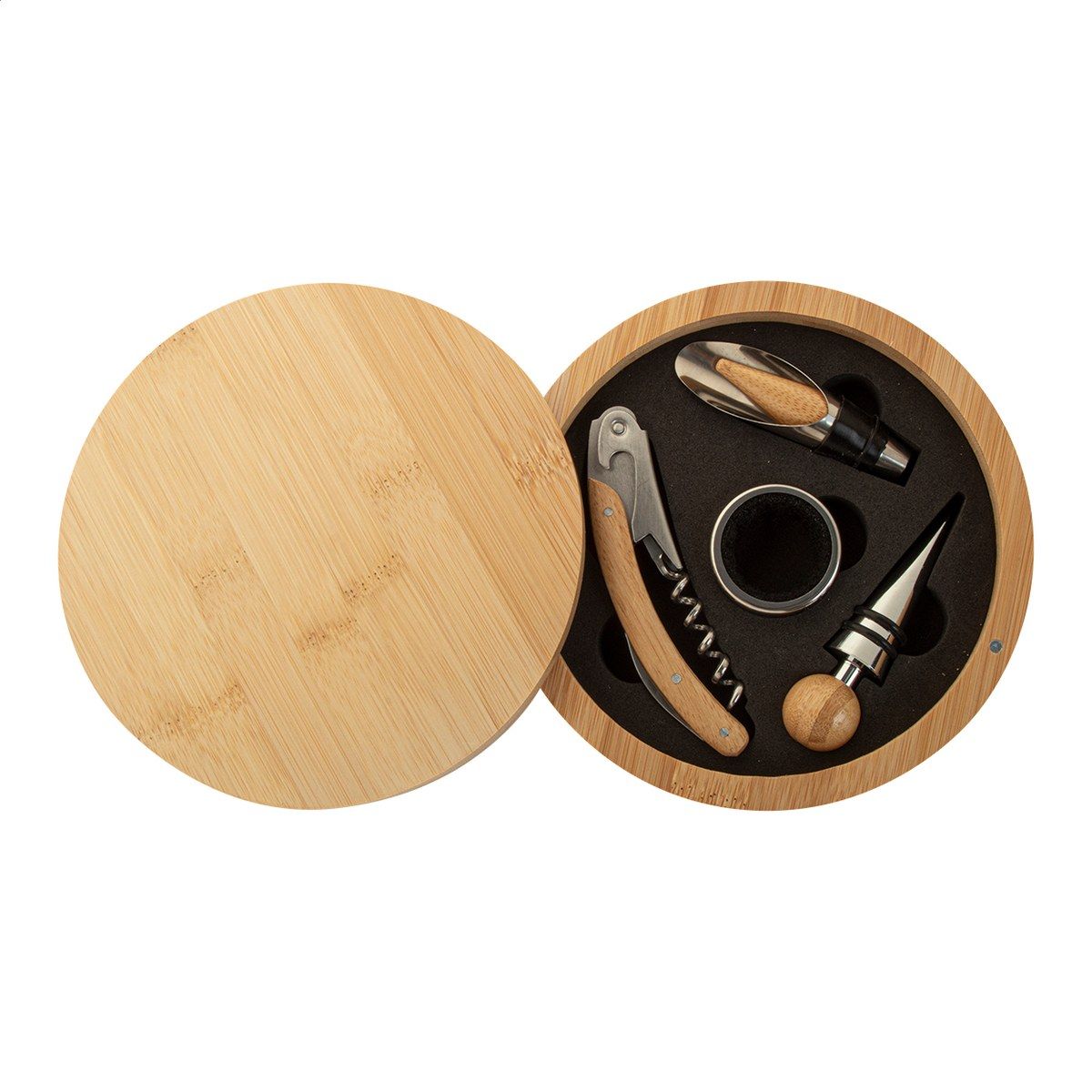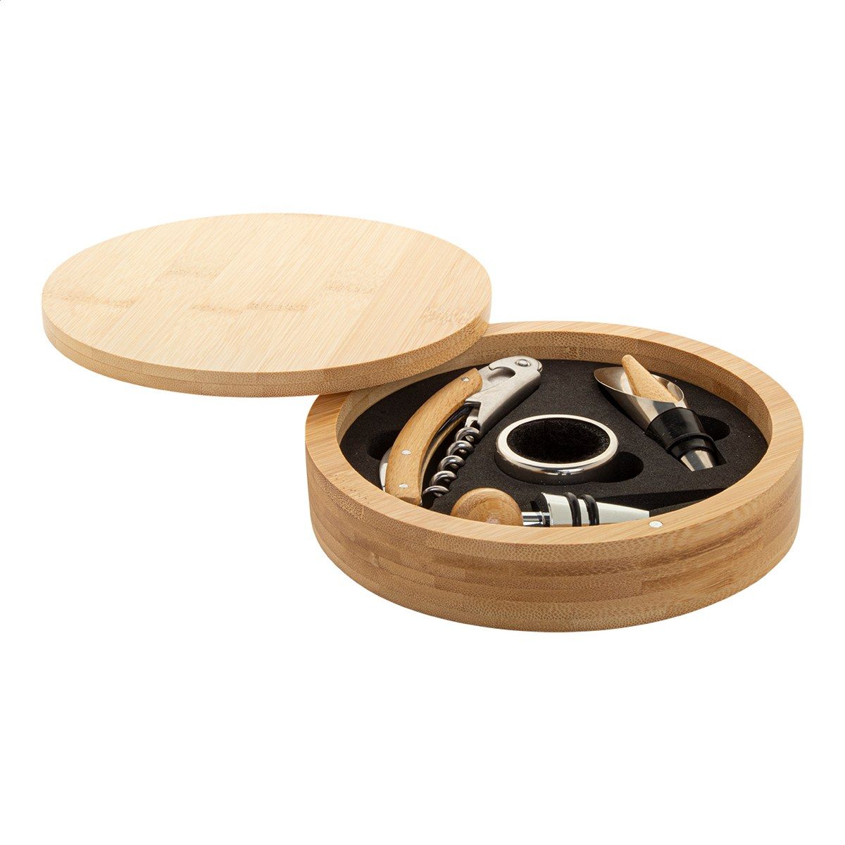 4dílná sada na víno z nerezové oceli vykládaná bambusem v kulaté bambusové krabičce. Včetně vývrtky, zátky, kroužku a nálevky.