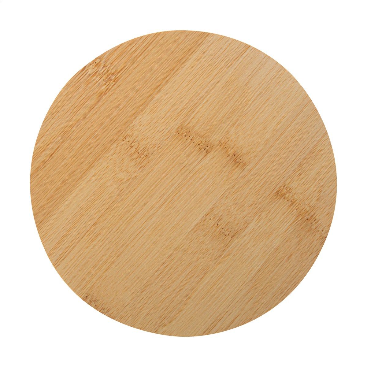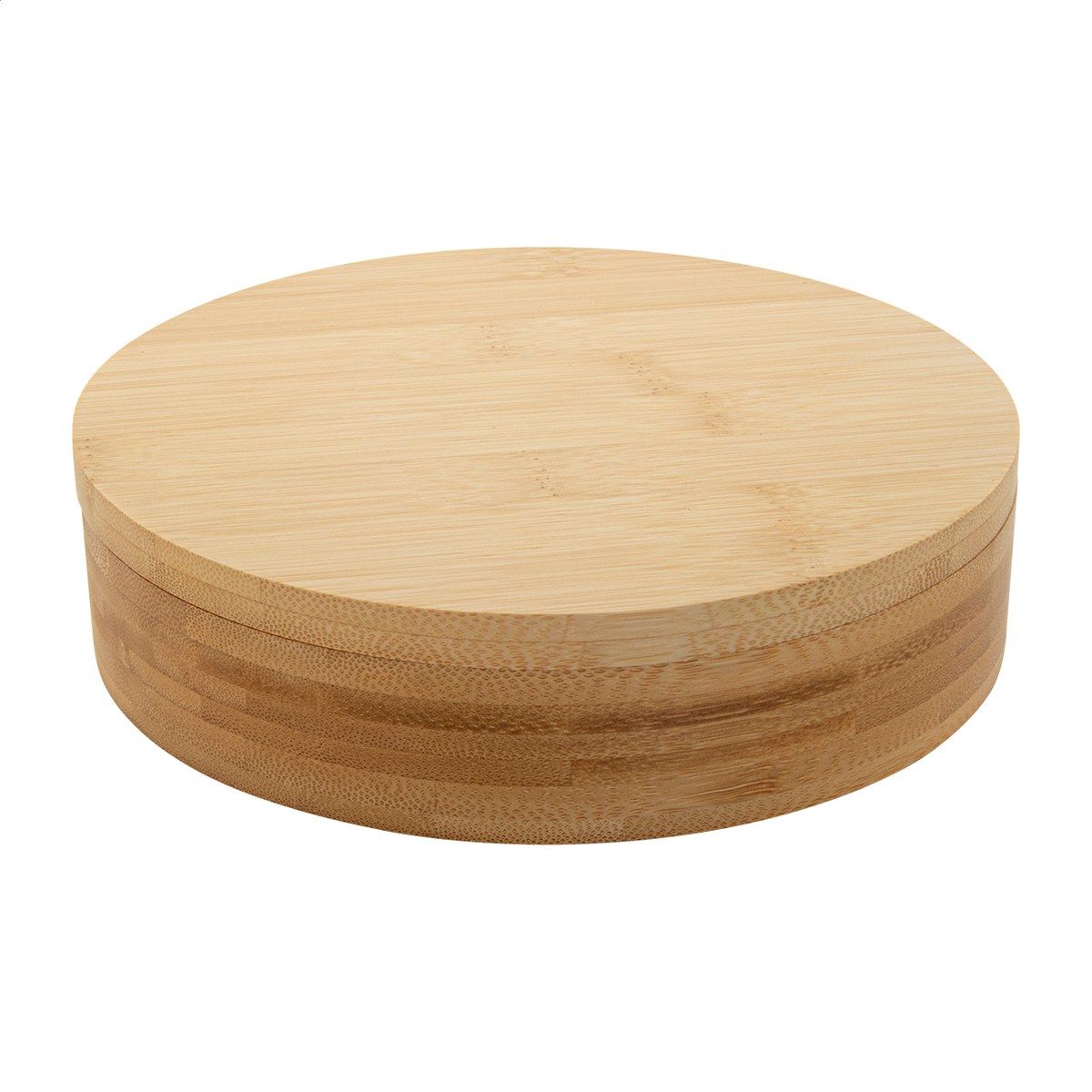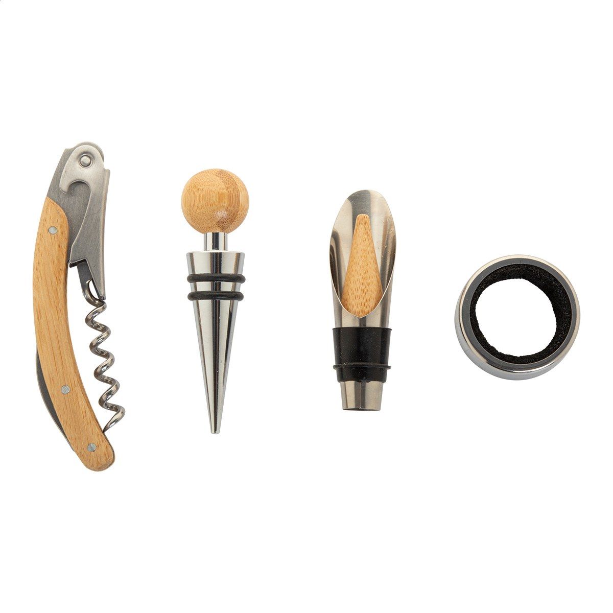 4dílná sada na víno z nerezové oceli vykládaná bambusem v kulaté bambusové krabičce. Včetně vývrtky, zátky, kroužku a nálevky.