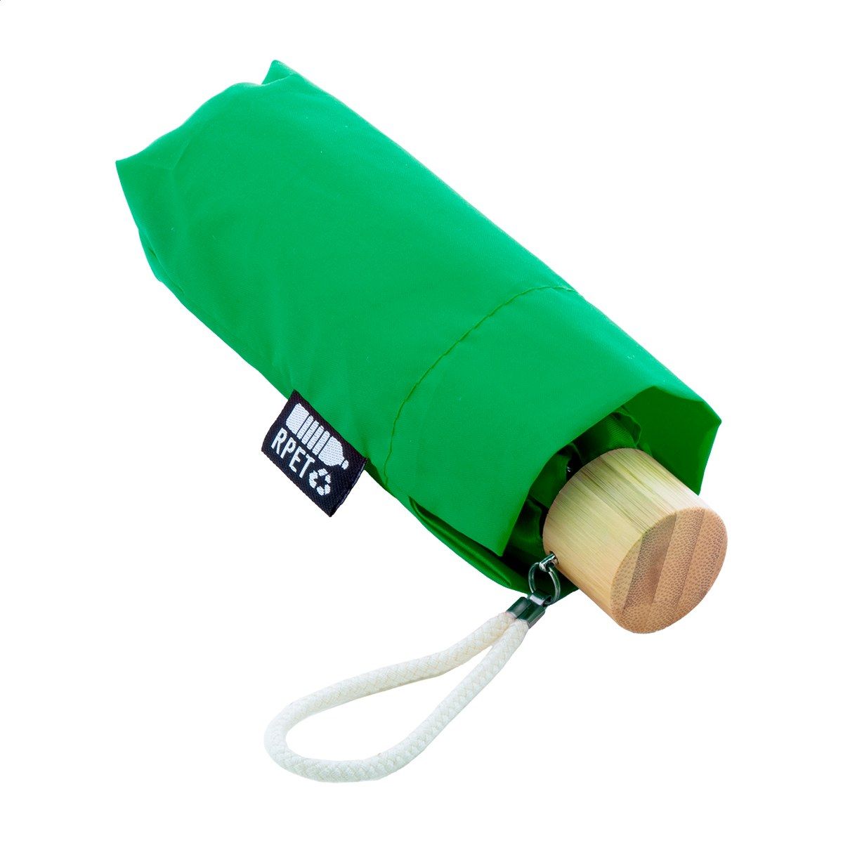 Manuální, větruodolný 3-skládací mini deštník s 6 panely v pouzdru v odpovídající barvě. S kovovým rámem, sklolaminátovými žebry, bambusovou rukojetí a bavlněným poutkem na ruku. 190T RPET pongee, s výrazným štítkem RPET.