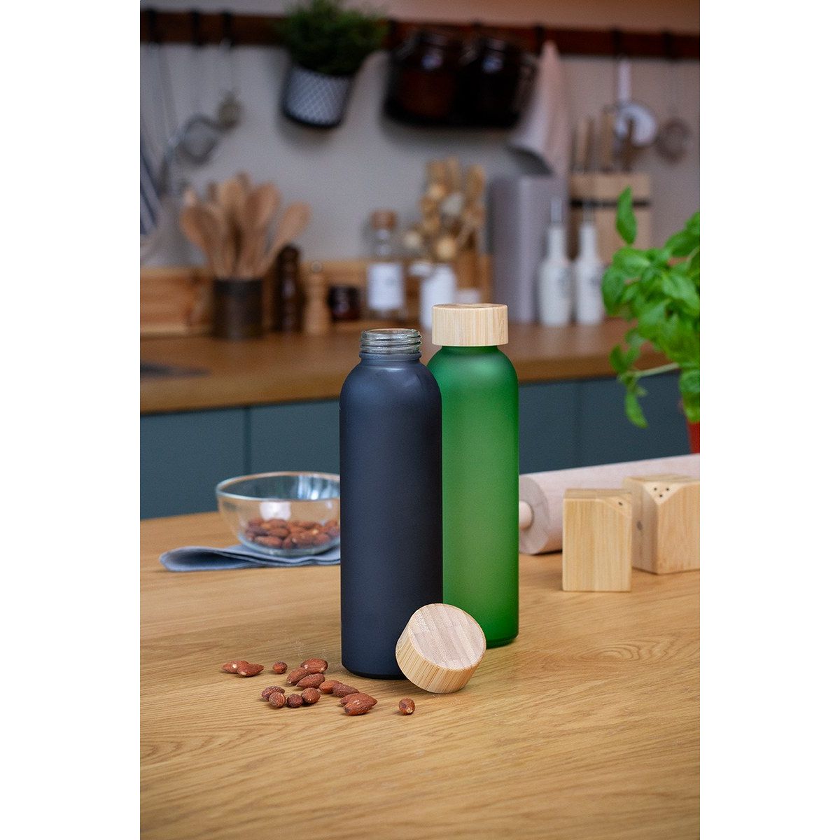 Láhev z matného skla s bambusovým uzávěrem, 500 ml. Nevhodné pro sycené nápoje.