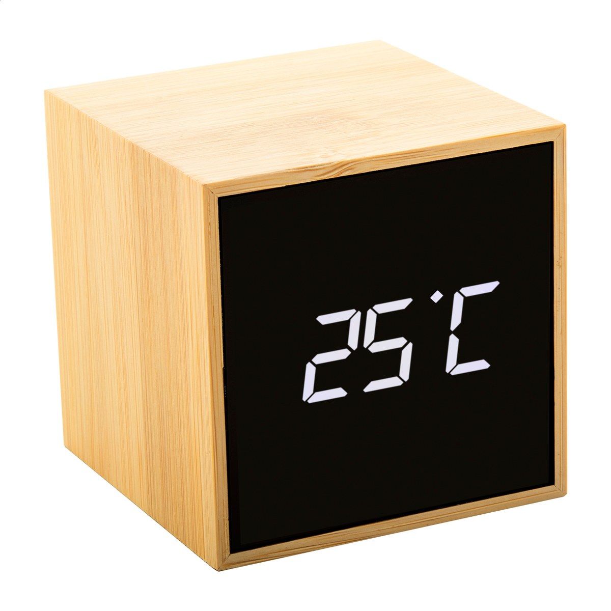 Bambusový, digitální budík a teploměr s bílým LED displejem. Může být napájen pomocí přiloženého nabíjecího kabelu USB nebo pomocí 3 baterií AAA (dodáváno bez baterií).
