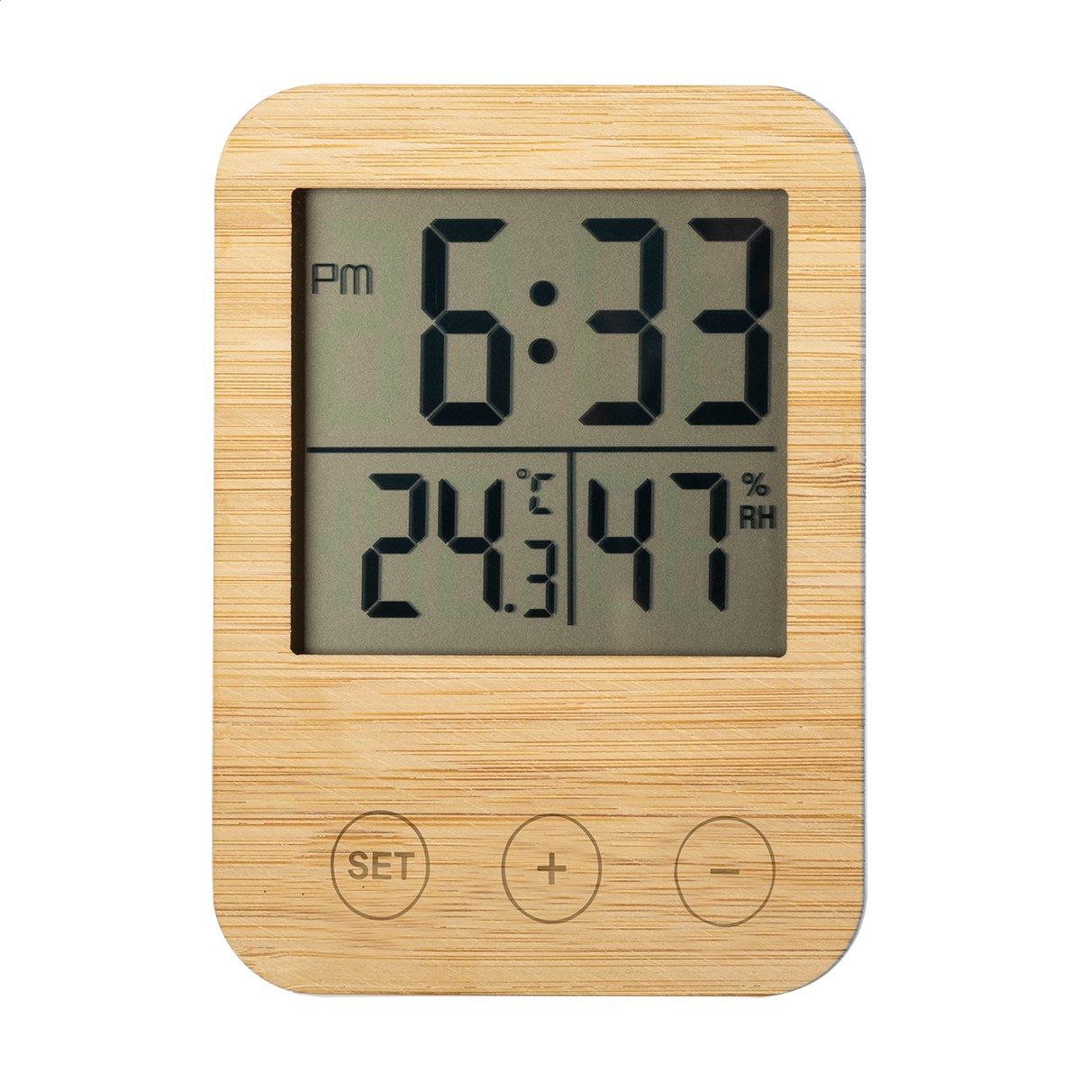 Bambusové digitální hodiny a meteorologická stanice s displejem teploty a vlhkosti. Pracuje se 2 AAA bateriemi, bez baterií.