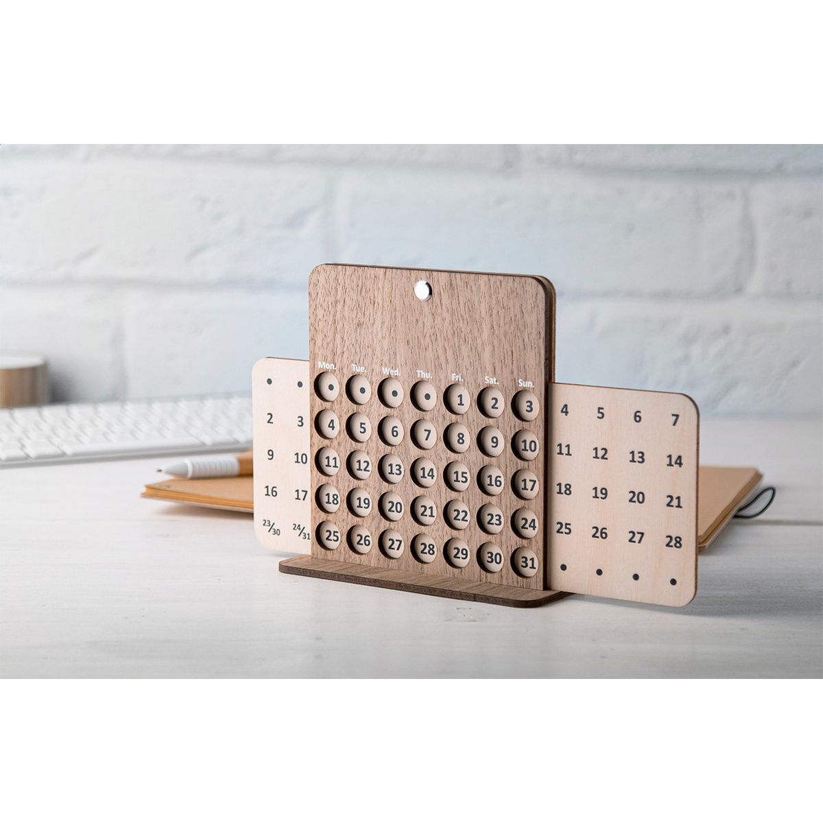 Věčný kalendář z březové a ořechové překližky. Dodáváno rozložené.