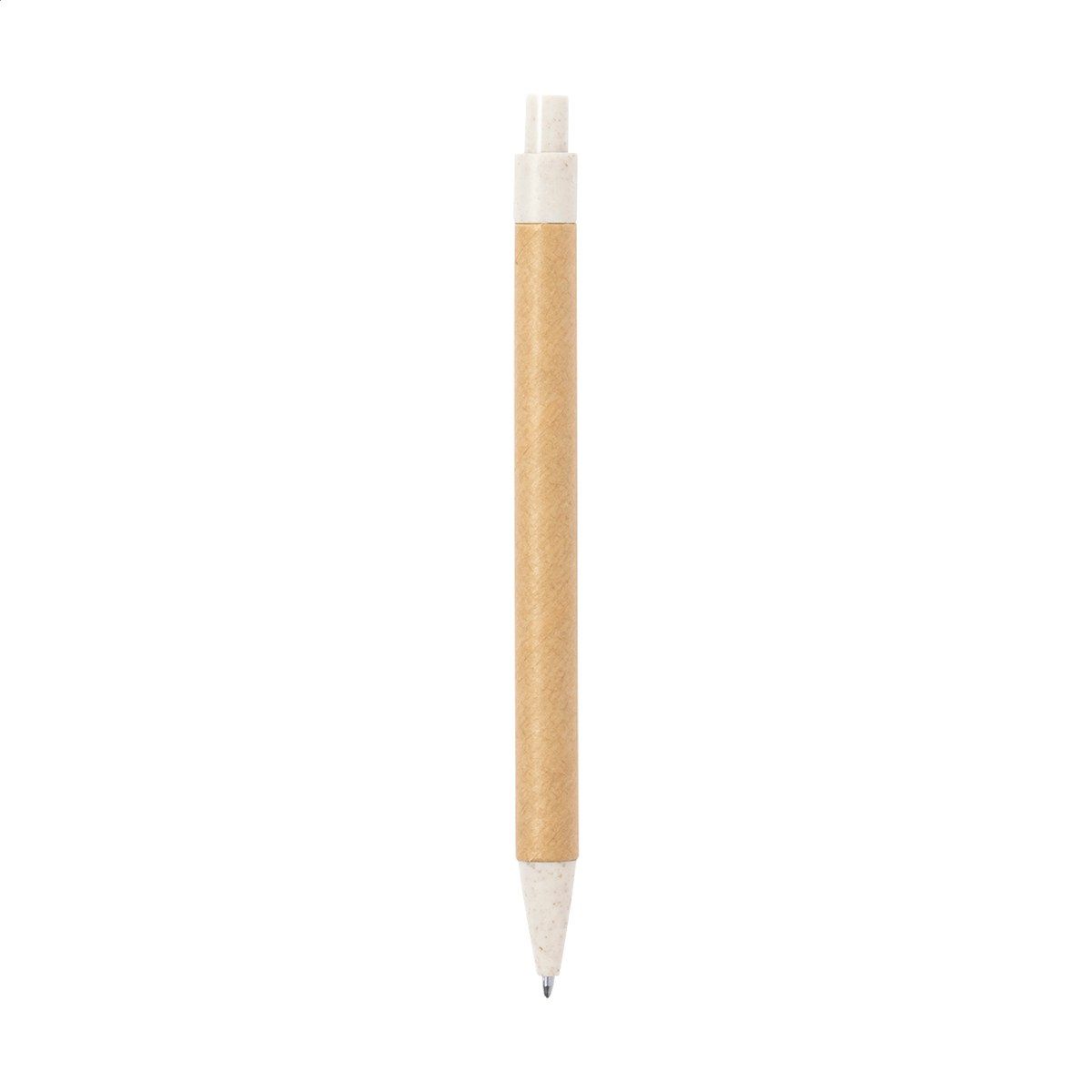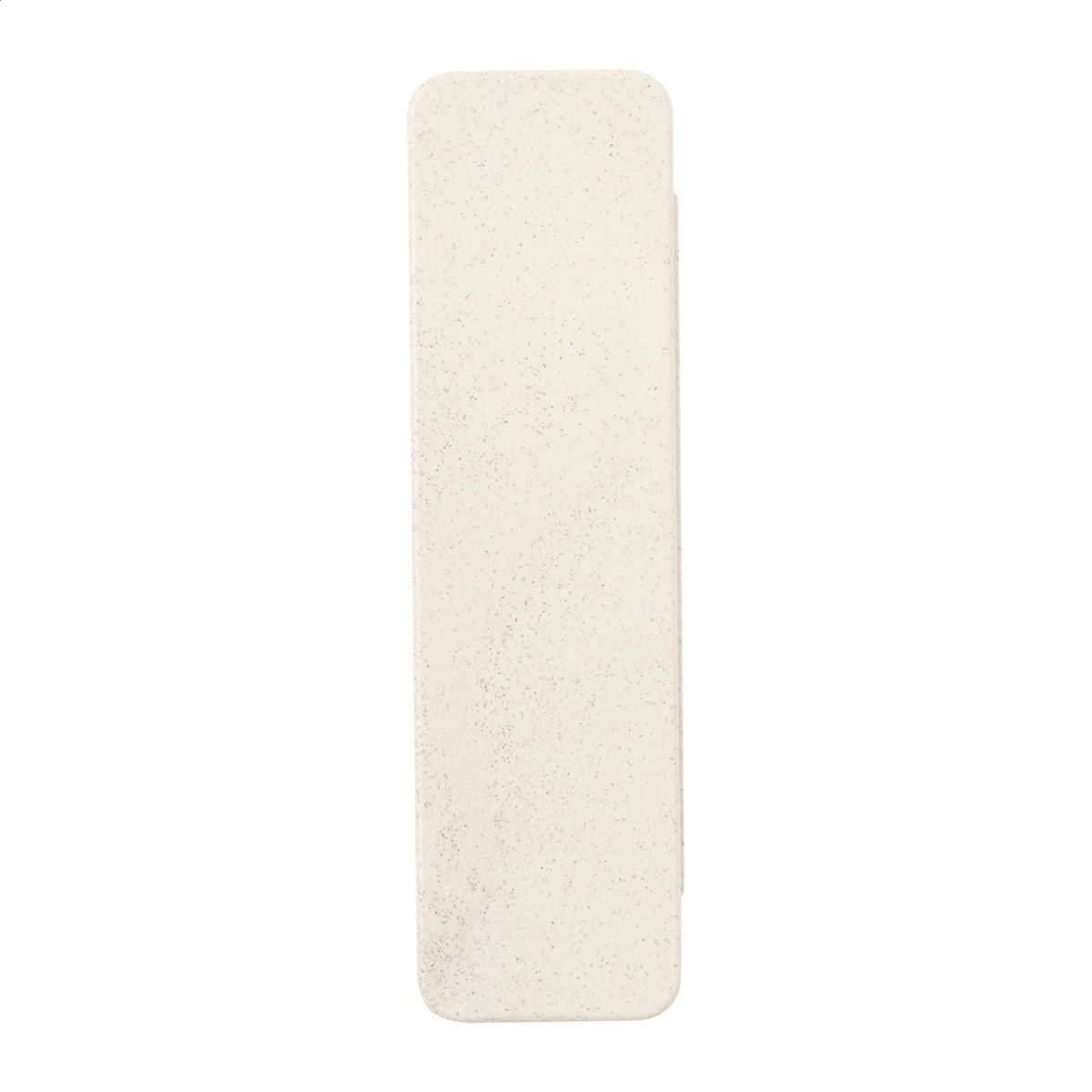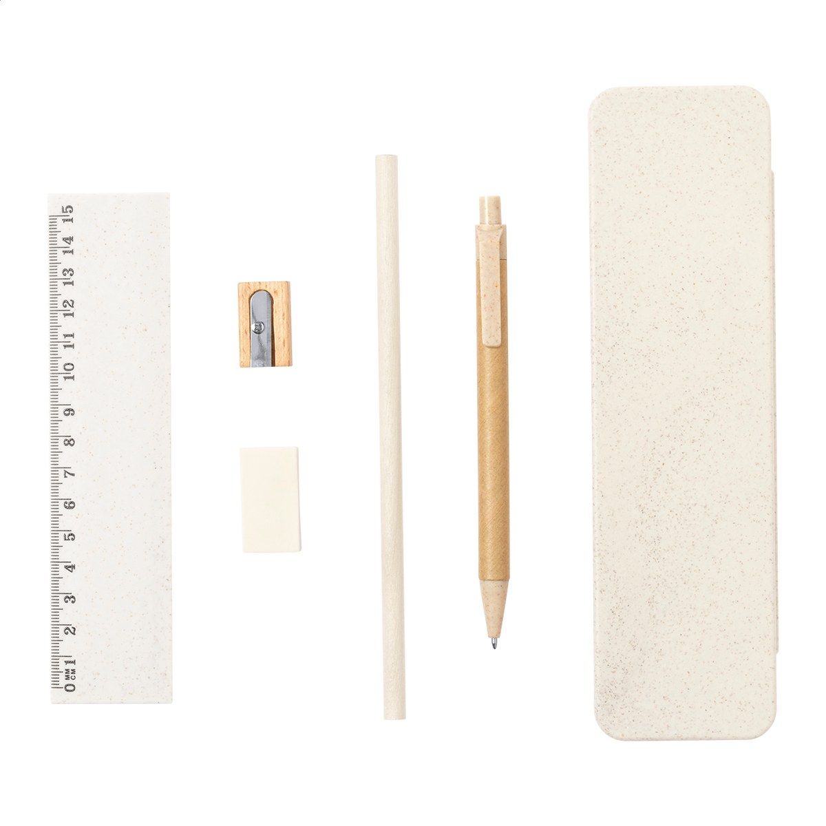 5ks psací sada v ekologickém pouzdře z pšeničné slámy. Včetně dřevěné tužky, recyklovaného papíru a plastového kuličkového pera z pšeničné slámy s modrou náplní, 15 cm pravítka, dřevěného ořezávátka a gumy.