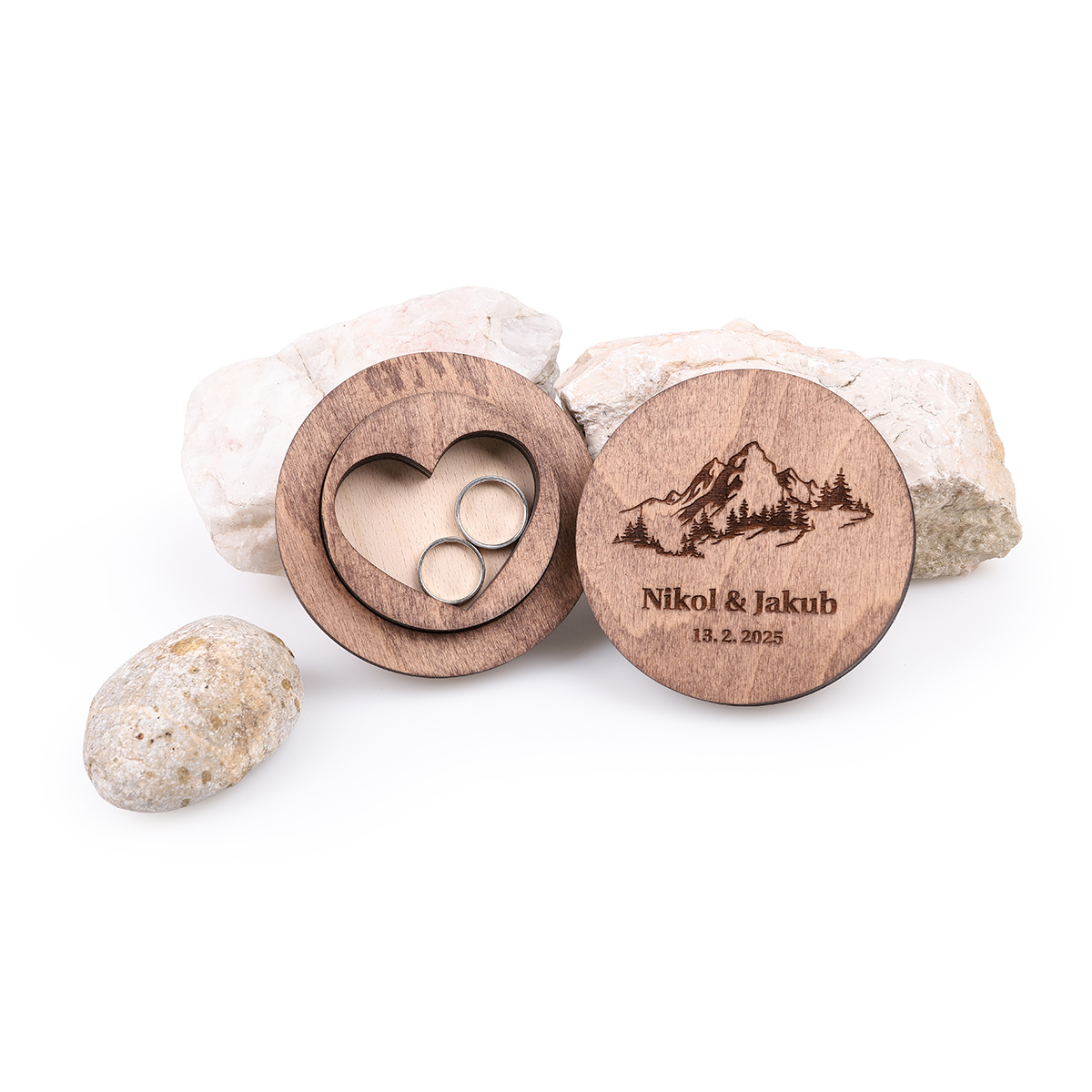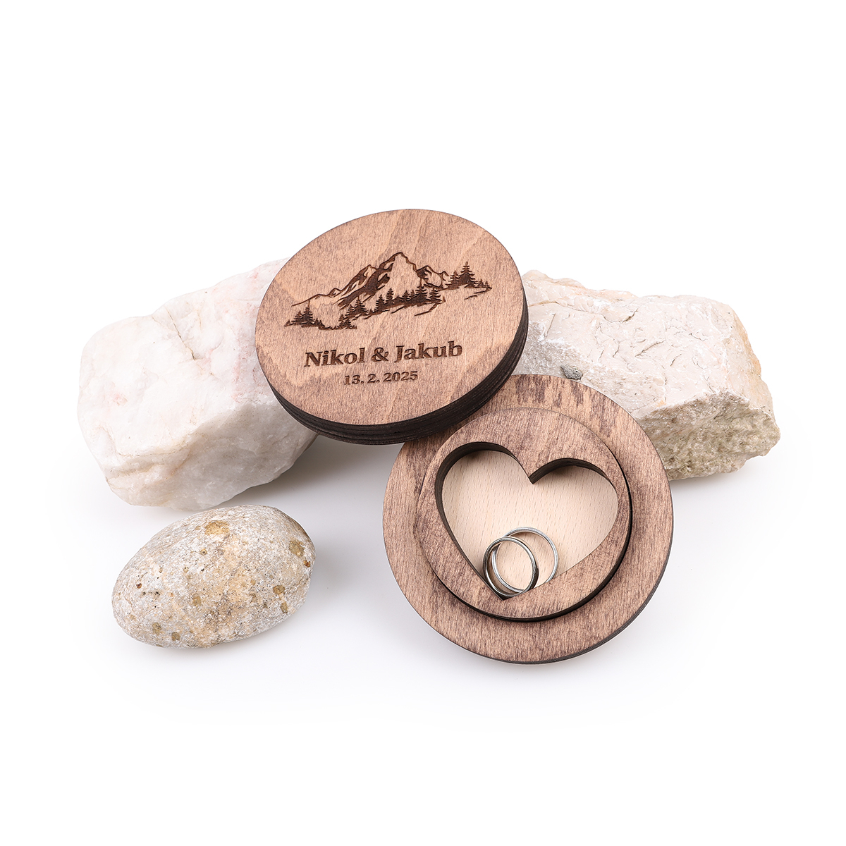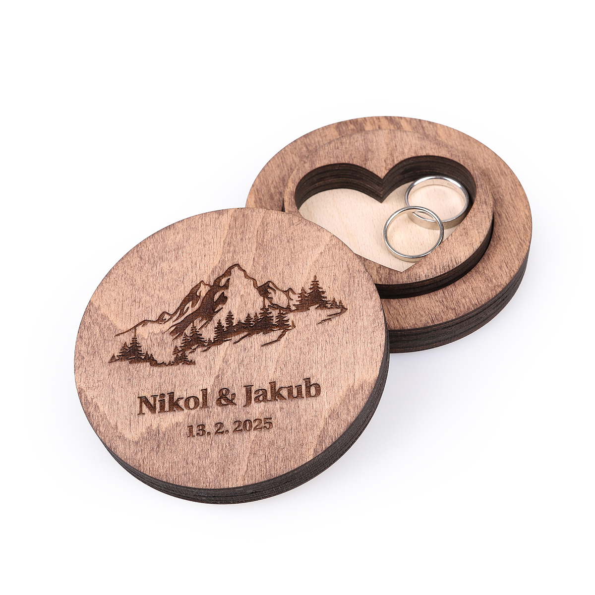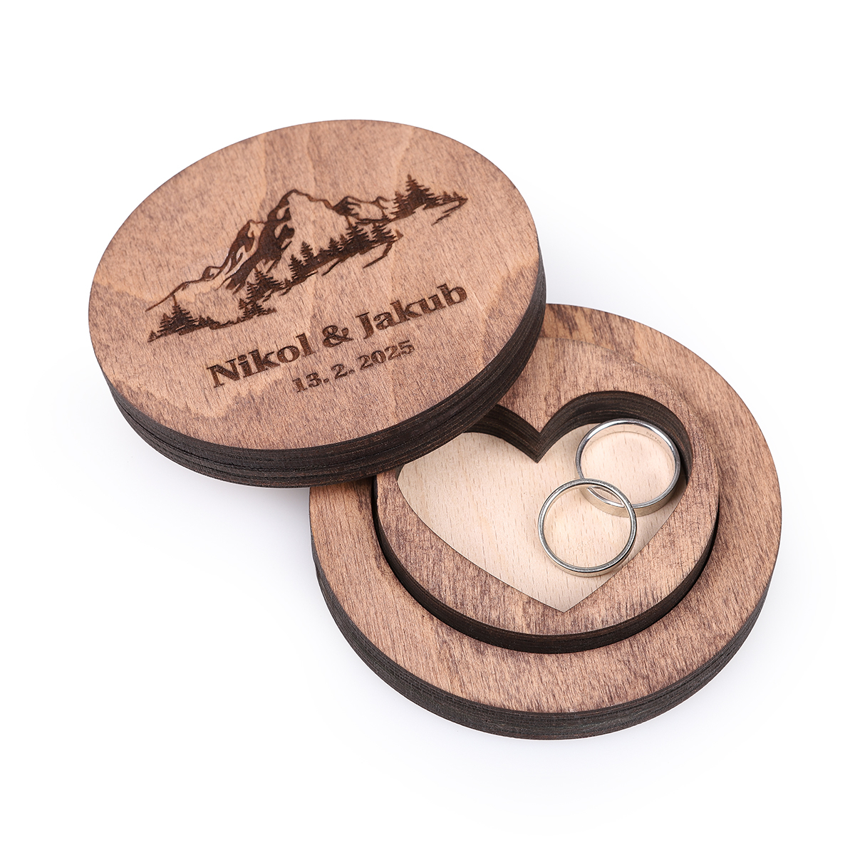 Snubní prsteny nejsou jen šperky – jsou symbolem slibu, lásky a společného začátku. Tato elegantní dřevěná krabička z bukové překližky je navržena tak, aby přesně tento okamžik podtrhla. Je kruhového tvaru o průměru 10 cm, s precizně vyřezaným srdcem uvnitř, které bezpečně pojme oba prsteny.