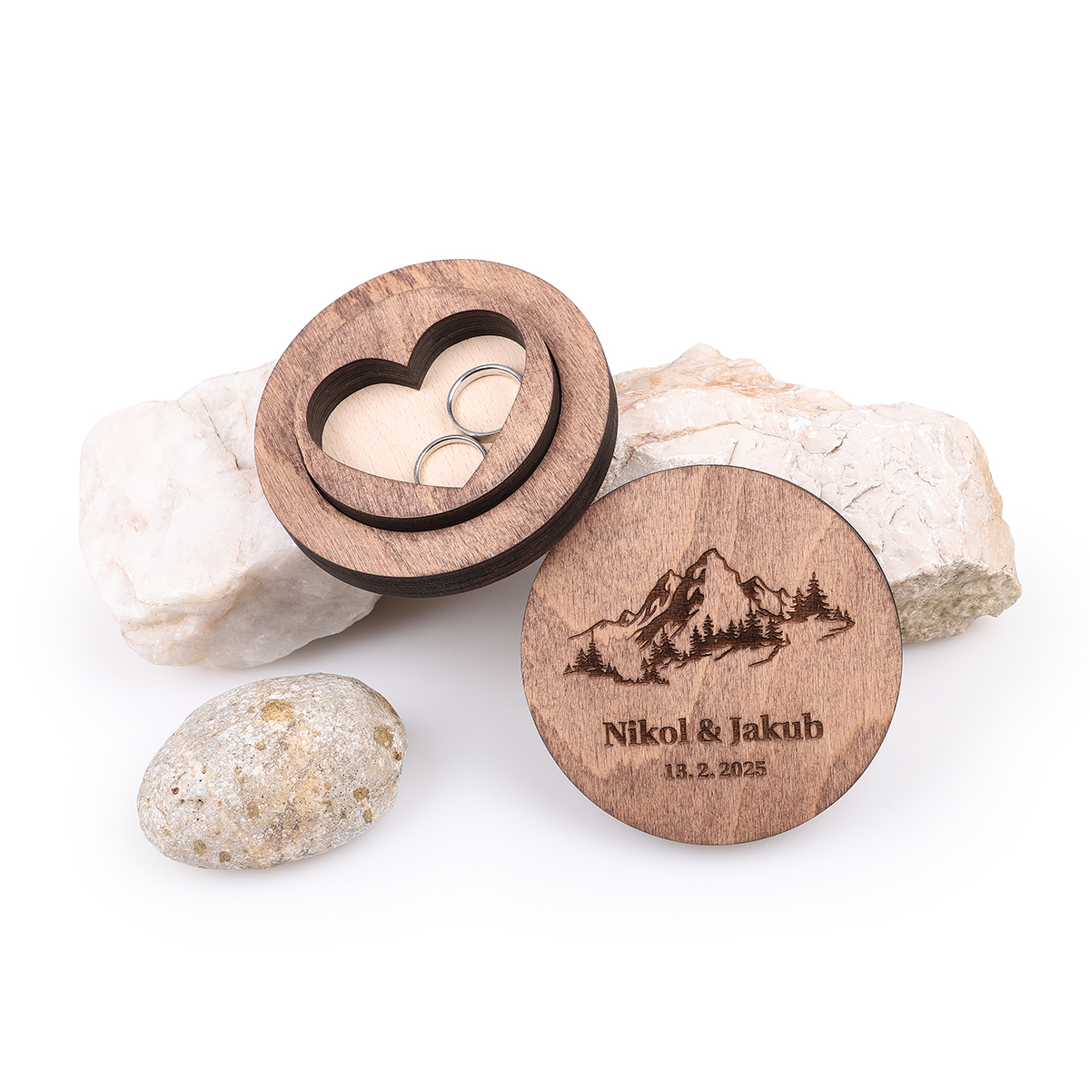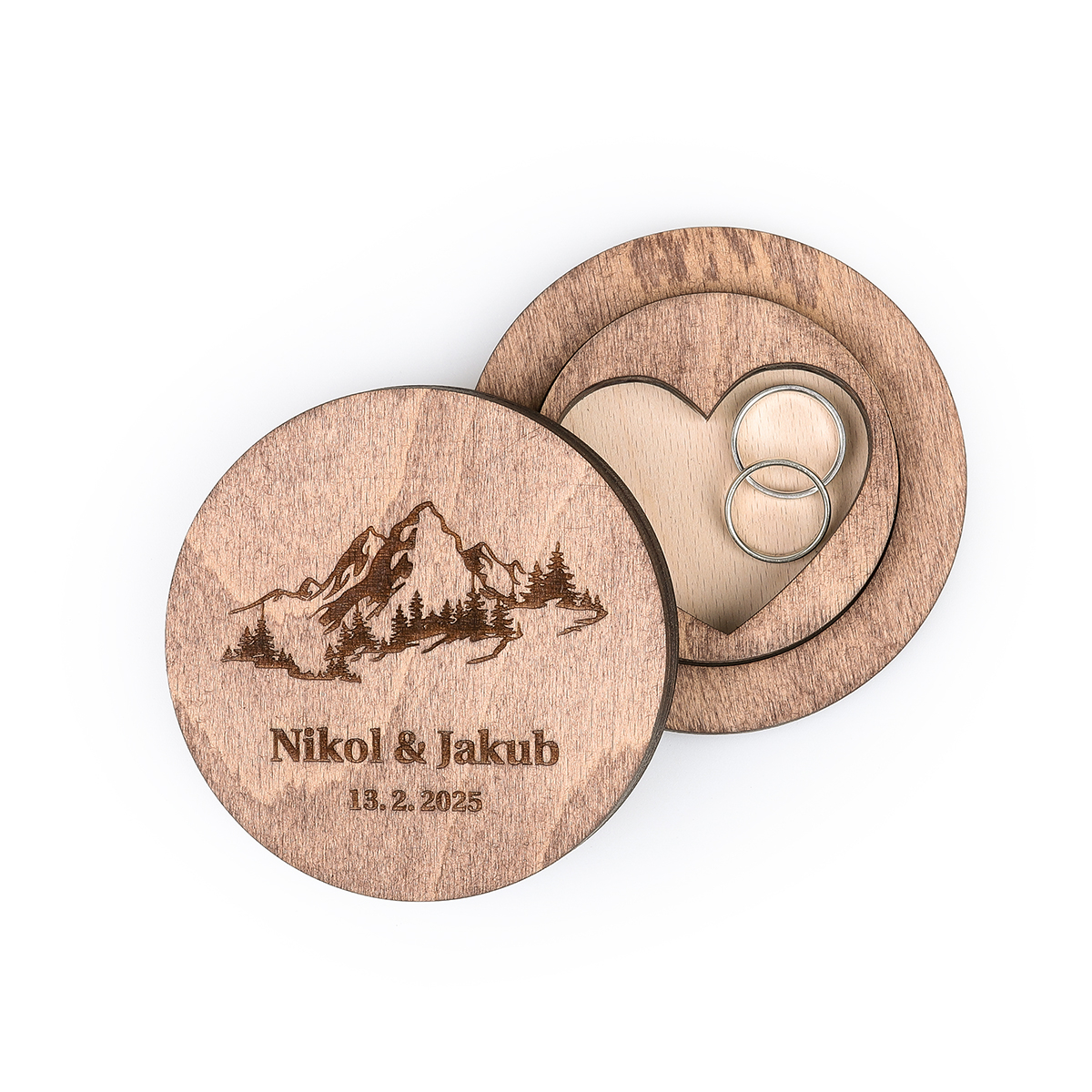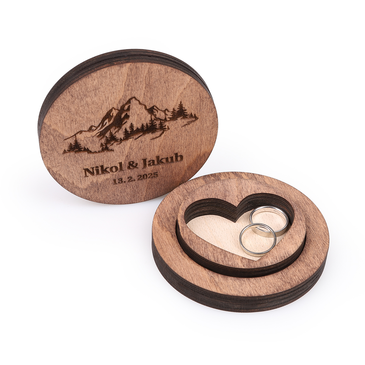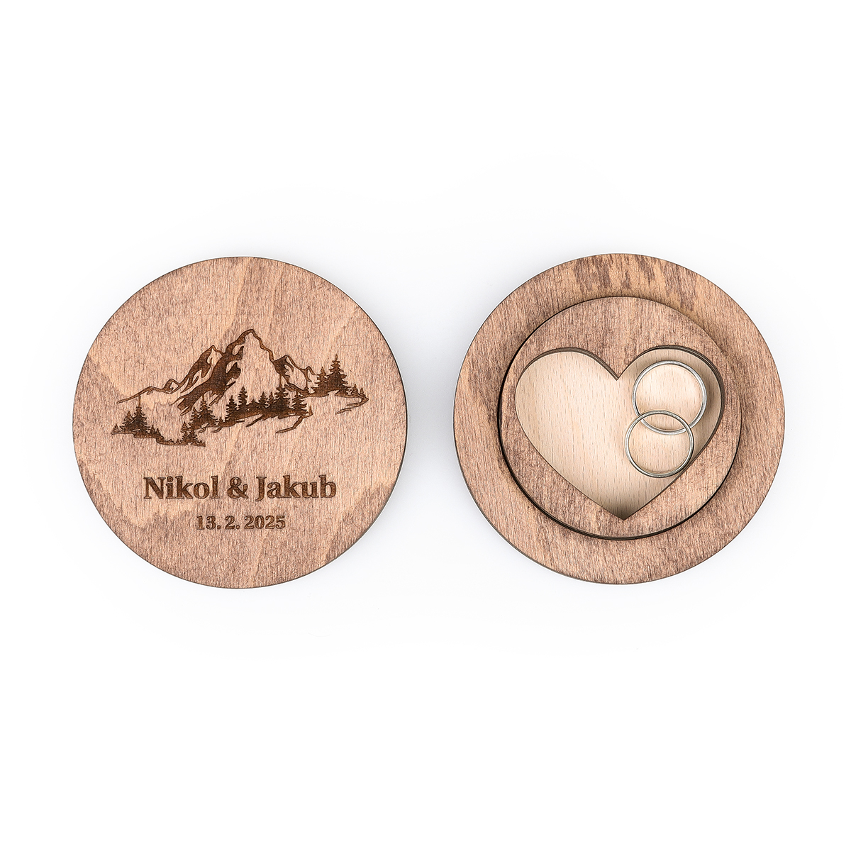 Snubní prsteny nejsou jen šperky – jsou symbolem slibu, lásky a společného začátku. Tato elegantní dřevěná krabička z bukové překližky je navržena tak, aby přesně tento okamžik podtrhla. Je kruhového tvaru o průměru 10 cm, s precizně vyřezaným srdcem uvnitř, které bezpečně pojme oba prsteny.