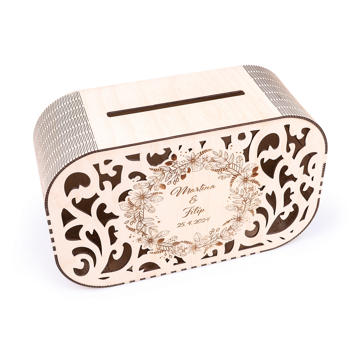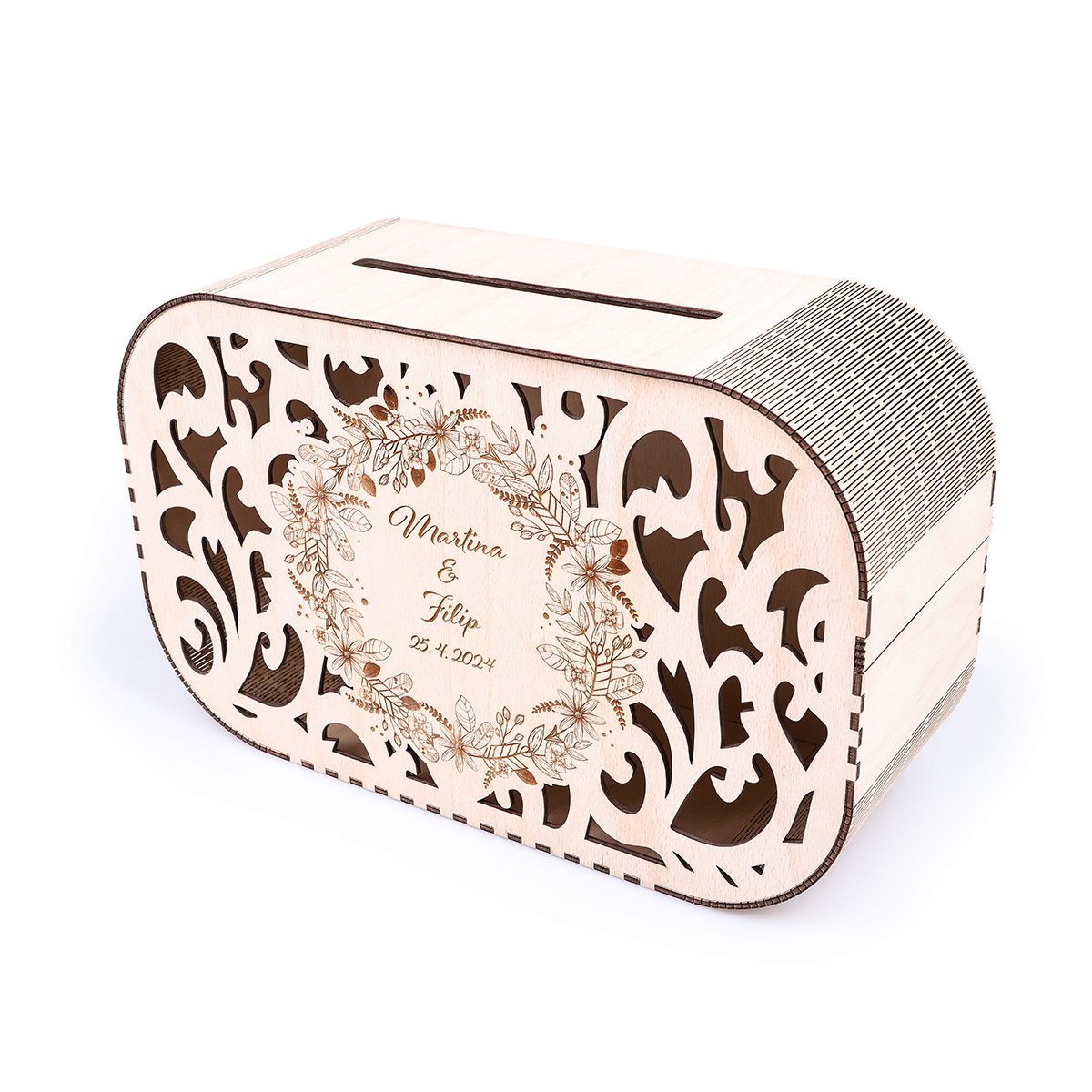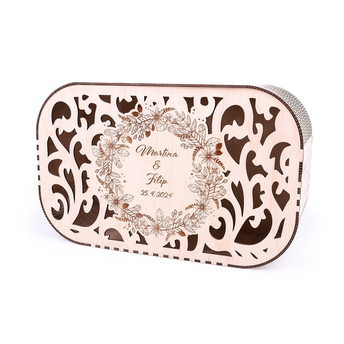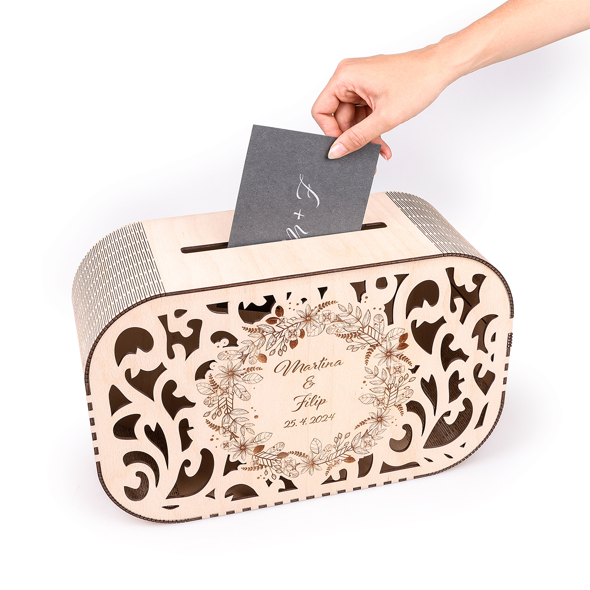 Box má rozměry 40 × 24 × 15 cm, takže se do něj vejde vše od kartiček po obálky. Jeho vyřezávané čelo působí slavnostně a přitom vkusně. Díky preciznímu zpracování se stane ozdobou svatební výzdoby a krásně zapadne na dárkový stůl či poblíž slavnostního stanu.
