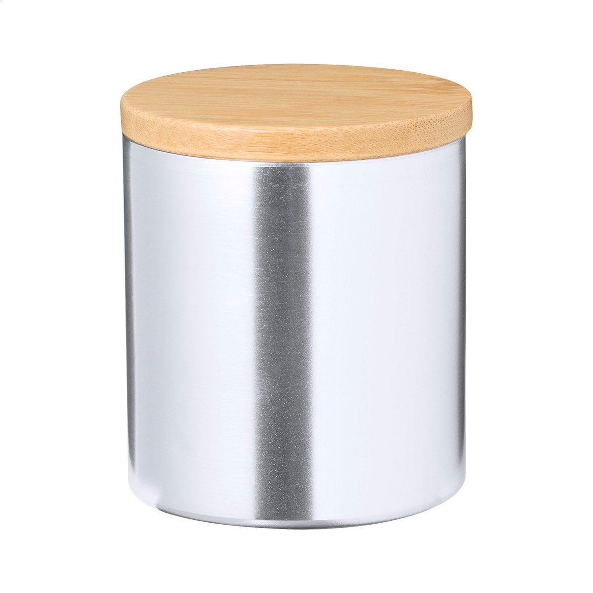 Vanilková vonná svíčka v hliníkovém držáku s bambusovým víčkem.