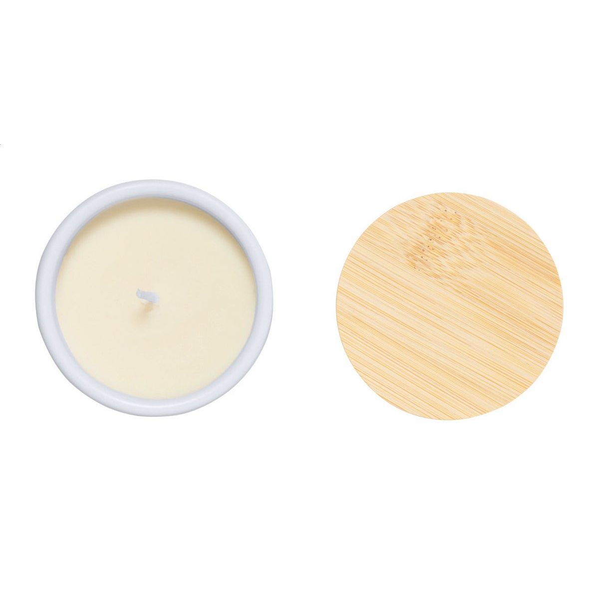 Rostlinná vosková svíčka s vůní vanilky v keramickém stojánku se dnem z přírodního korku a bambusovým víčkem.