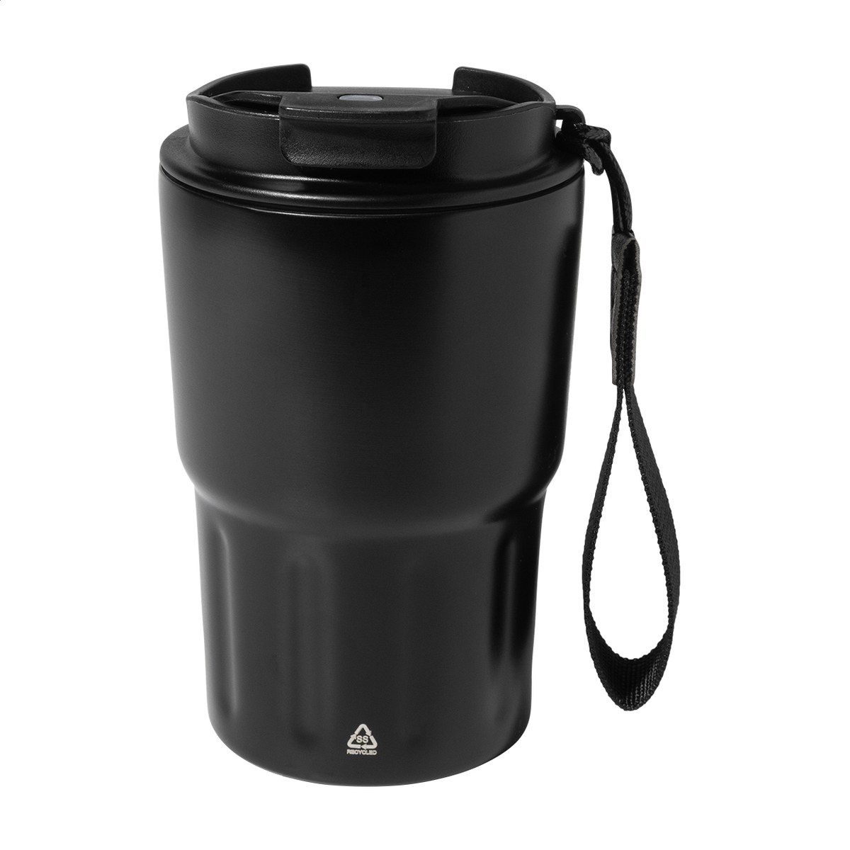 Dvoustěnný termo hrnek z recyklované nerezové oceli s izolačním víčkem z PP. S poutkem z RPET polyesteru. 350 ml.