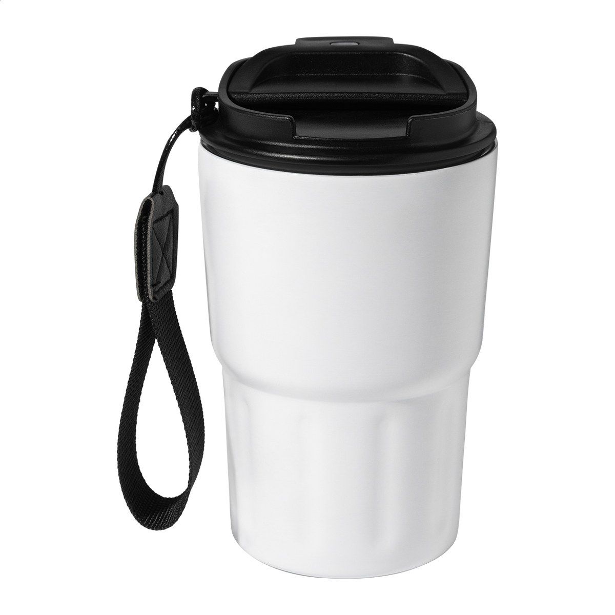 Dvoustěnný termo hrnek z recyklované nerezové oceli s izolačním víčkem z PP. S poutkem z RPET polyesteru. 350 ml.
