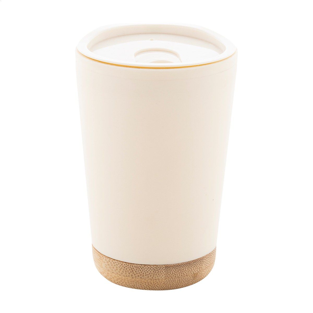 Dvoustěnný termo hrnek izolovaný PP plastem s víčkem na pití a bambusovým dnem, 260 ml.