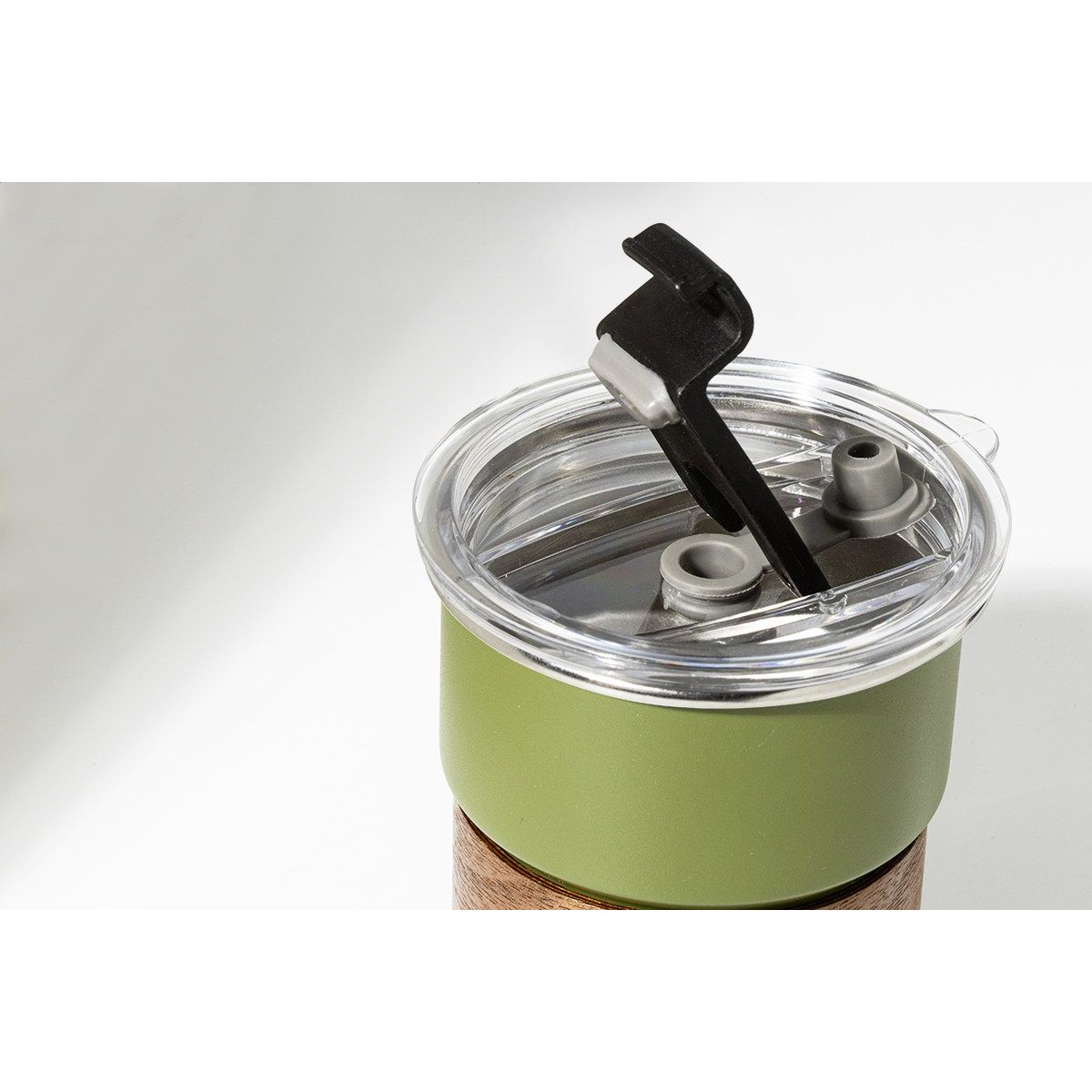Jednostěnný cestovní hrnek z recyklované nerezové oceli s úchopem z ořechového dřeva, plastovým víčkem a brčkem z recyklované nerezové oceli. 260 ml.