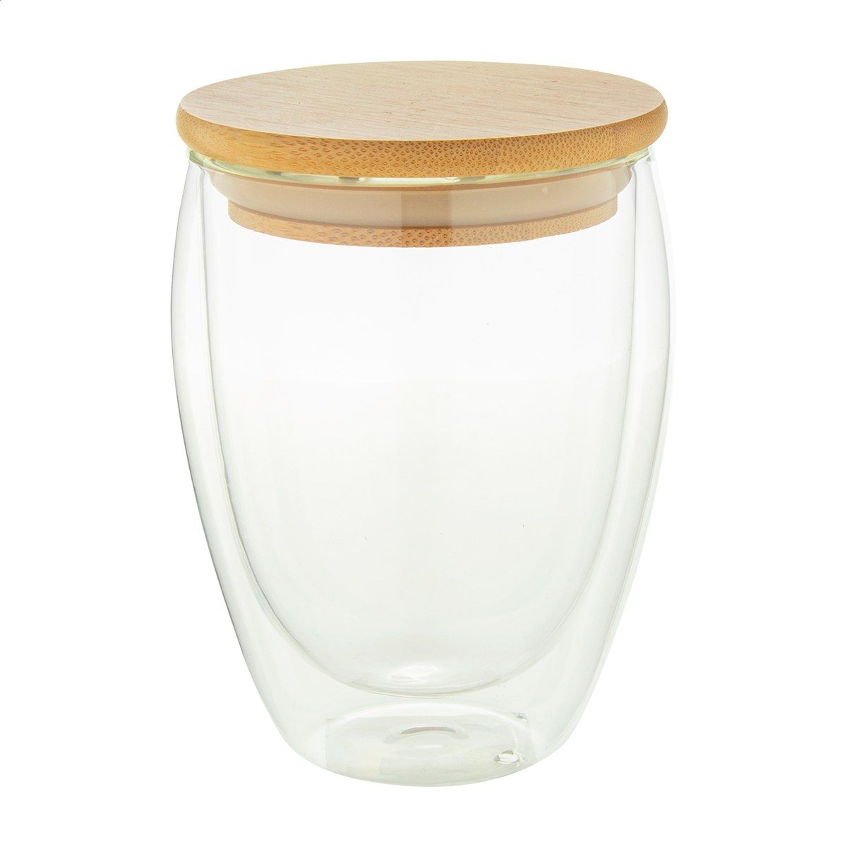Dvoustěnný termohrnek z borosilikátového skla s bambusovým víčkem, 320 ml. V kraftové papírové krabici.