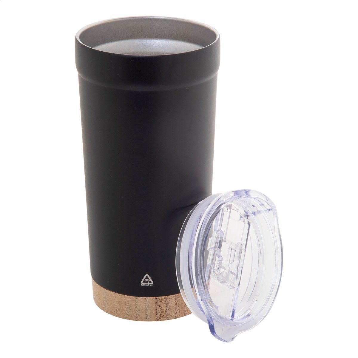Dvoustěnný vakuově izolovaný termo hrnek z recyklované nerezové oceli s bambusovým dnem a AS plastovým víčkem na pití. 600 ml.