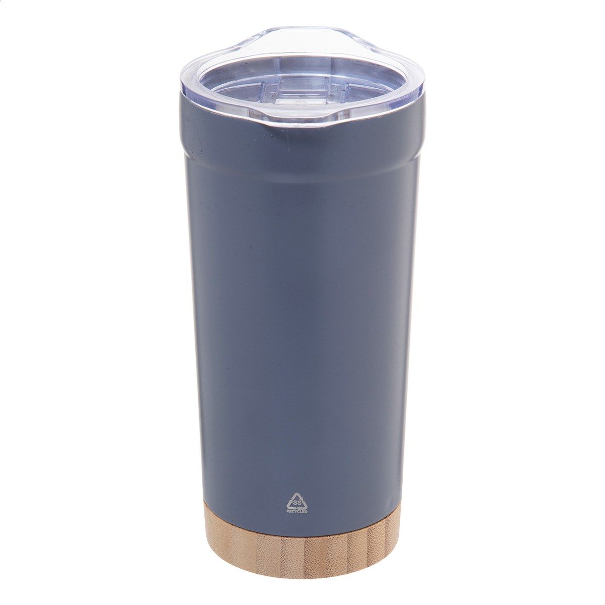 Dvoustěnný vakuově izolovaný termo hrnek z recyklované nerezové oceli s bambusovým dnem a AS plastovým víčkem na pití. 600 ml.