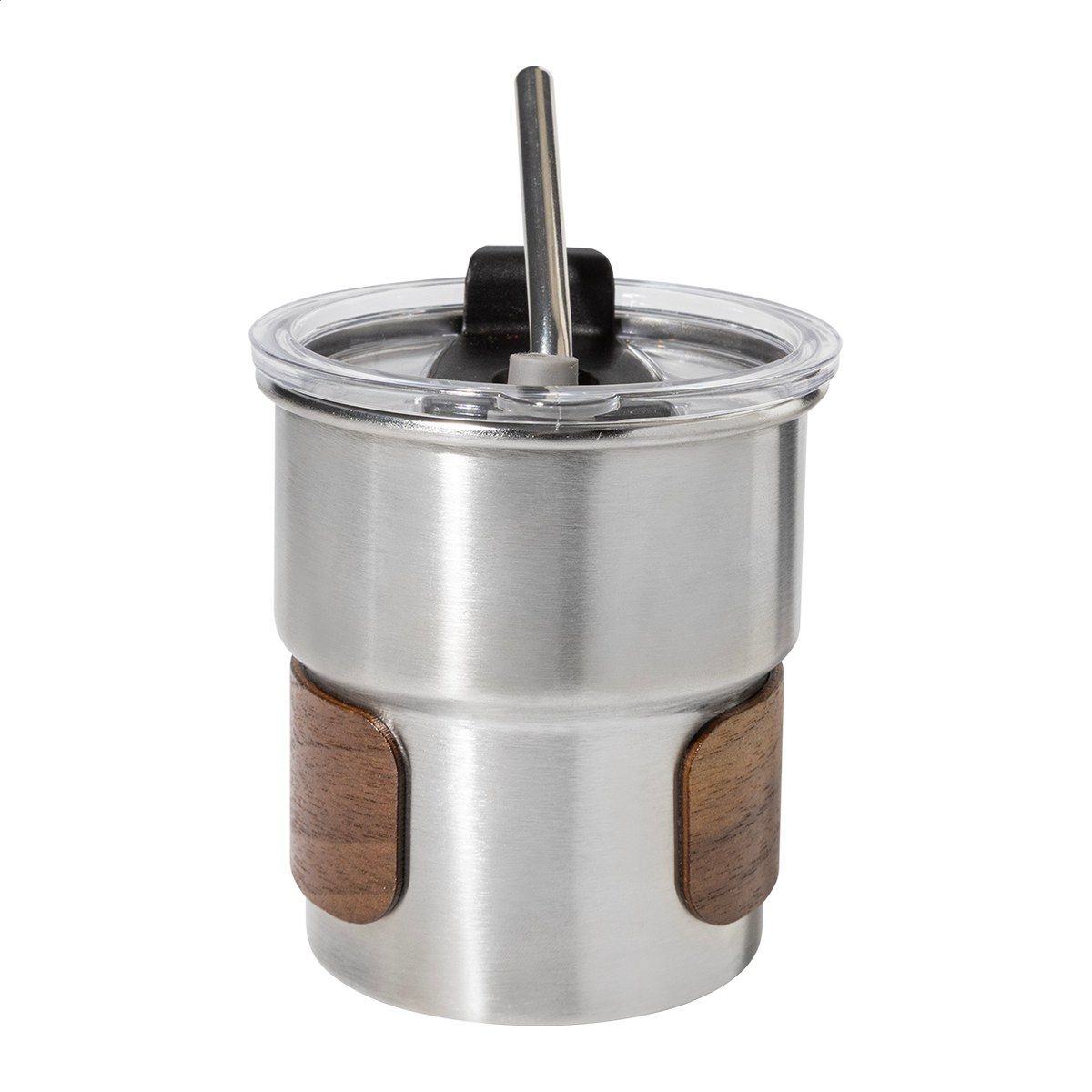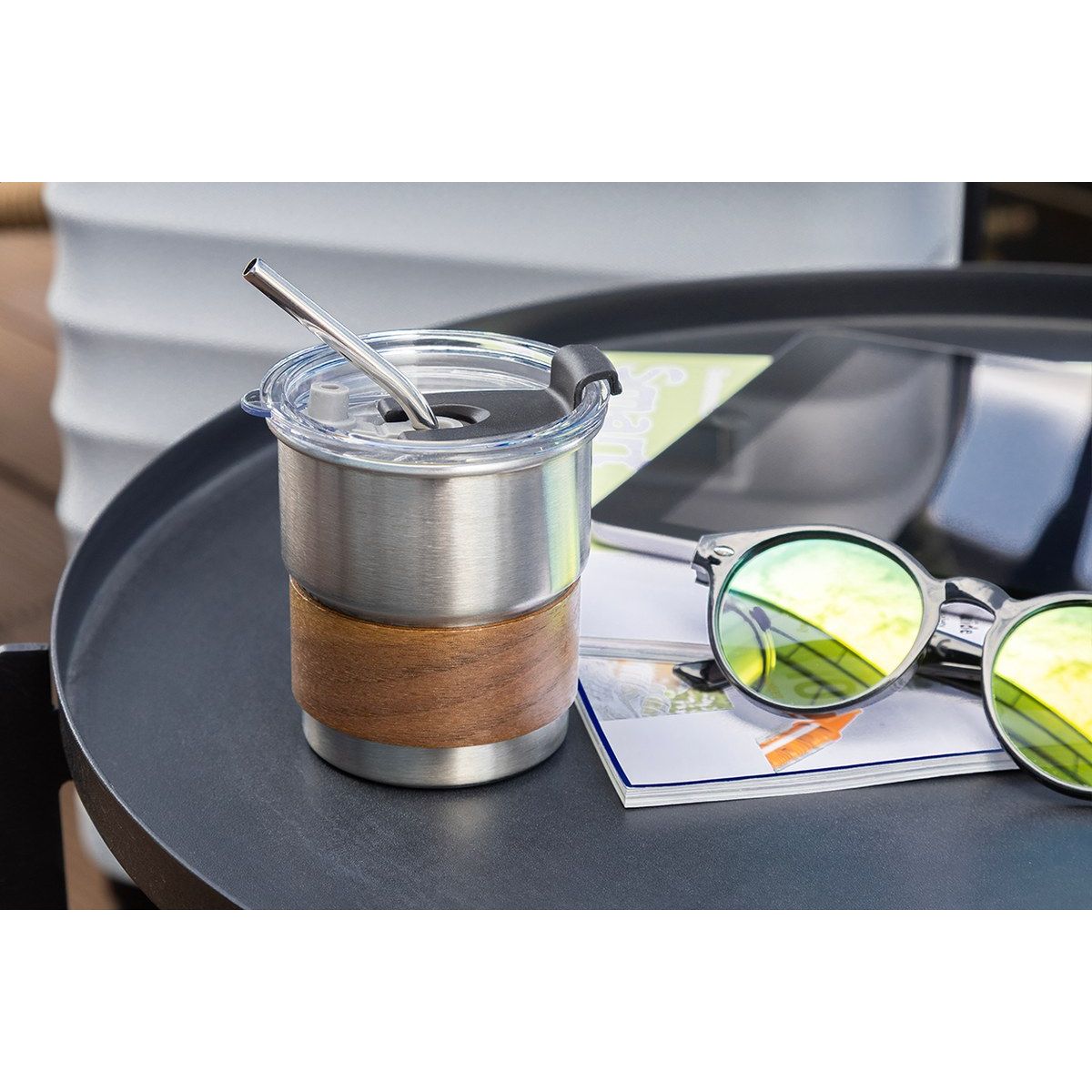 Jednostěnný cestovní hrnek z recyklované nerezové oceli s úchopem z ořechového dřeva, plastovým víčkem a brčkem z recyklované nerezové oceli. 260 ml.