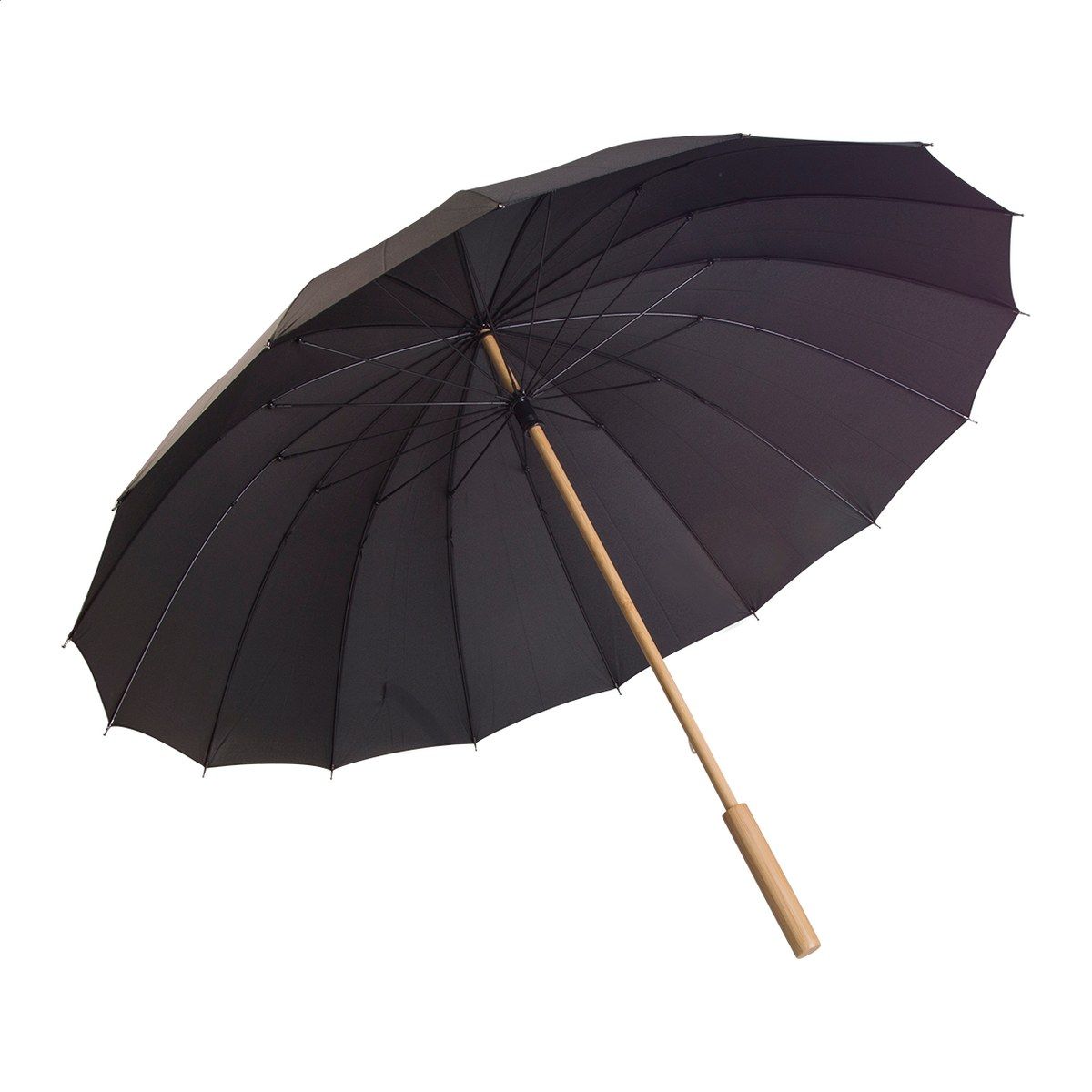 Manuální, větruodolný deštník s 16 panely, bambusovou rukojetí a držadlem, sklolaminátovým rámem a žebry. V barevném pouzdře. Pongee 190T RPET. S výrazným štítkem RPET.