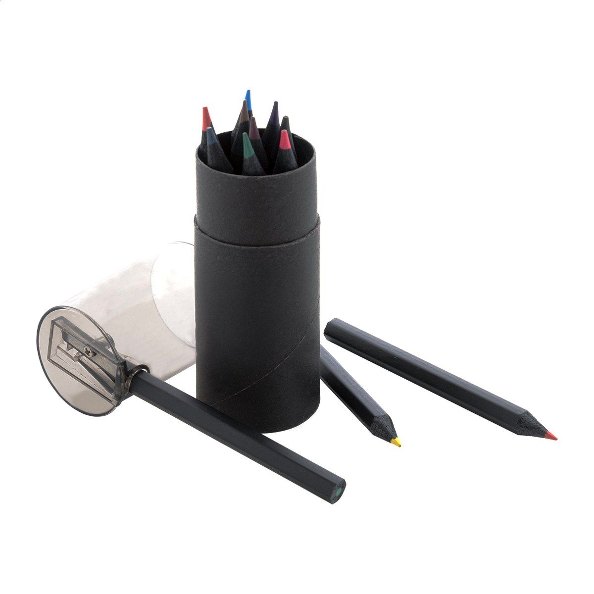 12dílná sada pastelek z černého dřeva v kulatém černém pouzdře z kartonu s plastovým ořezávátkem.