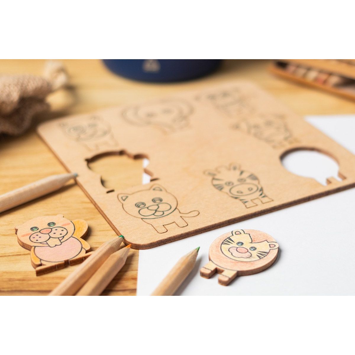 Vybarvovací hra z březové překližky s jutovým pouzdrem. Obsahuje tématické vyřezávané figurky (8 ks) a dřevěné barevné tužky (12 ks) v papírové krabičce.
